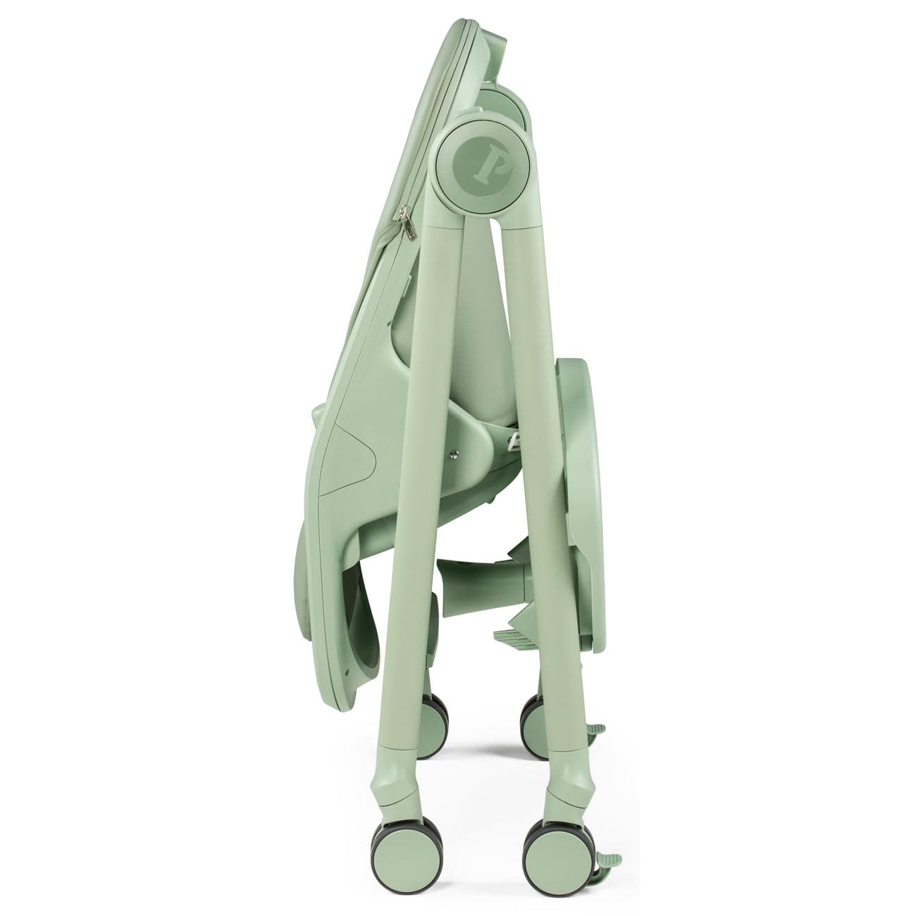 Innovative closing system with buttons on the side joints. When closed, the high chair is extremely compact and remains upright even with the tray in place.