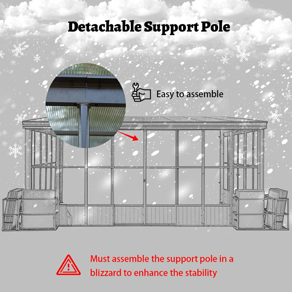 The Domi Outdoor Living Sunroom comes with detailed instructions for easy assembly. Pre-drilled holes for ground and wall mounting provide enhanced stability and security, ensuring your sunroom is securely attached and ready to use in no time. The required tools and clear guidelines make the setup process straightforward and hassle-free.