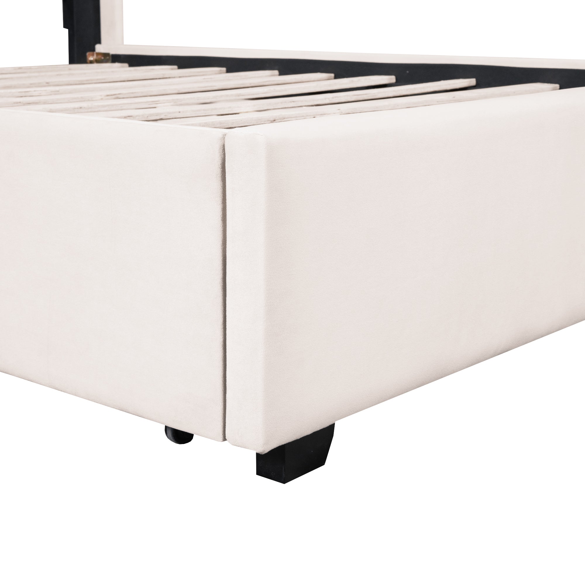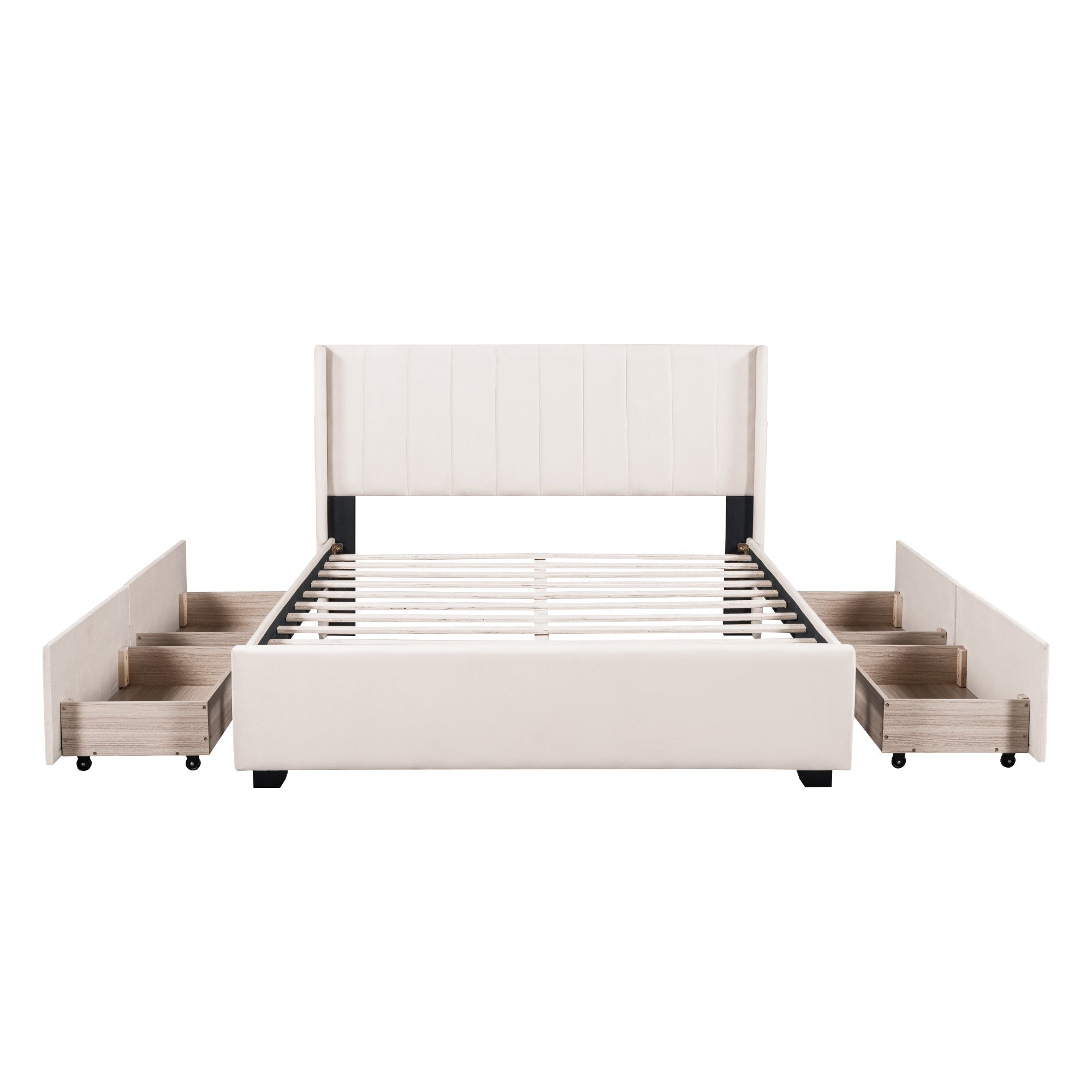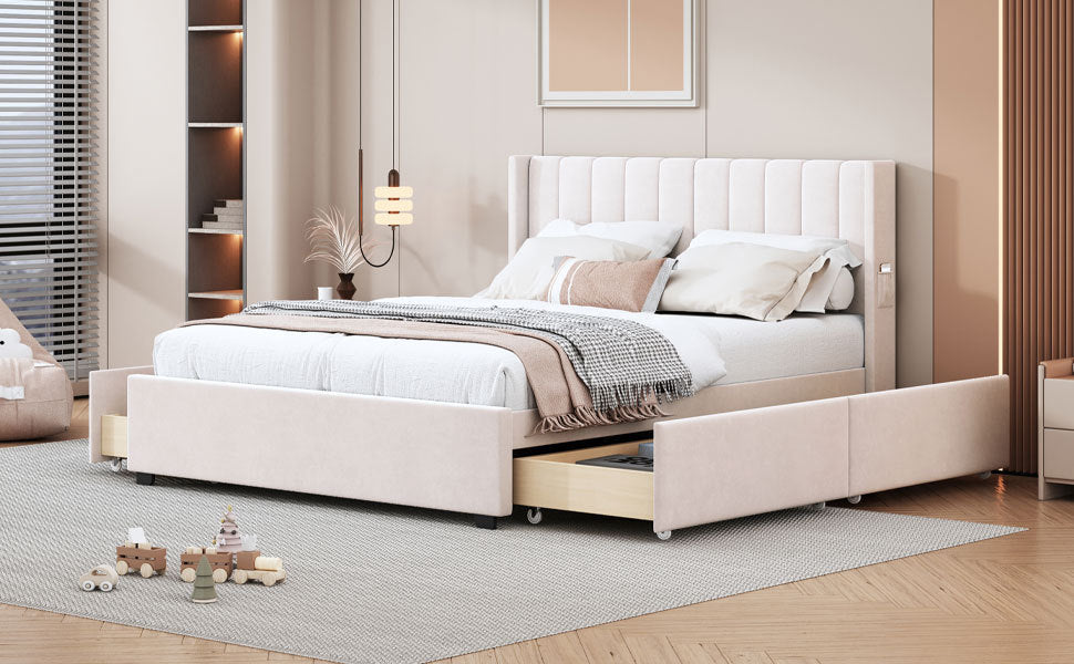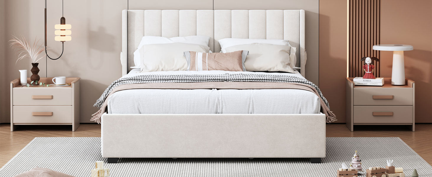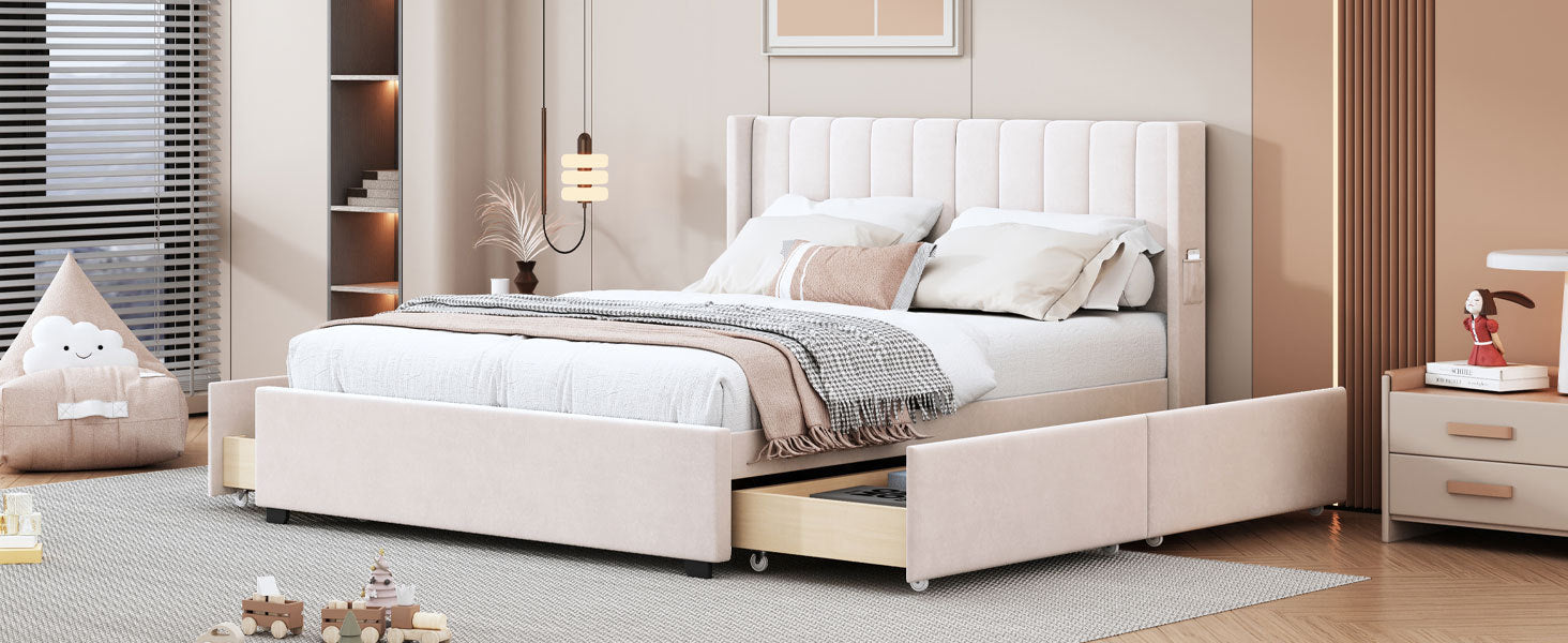 Velvet-Upholstered platform bed with beautiful finish has a sleek exterior profile, built-in headboard and footboard, with clean lines for a timeless look. There is 1 little pocket beside either side of the bed provides storage space for phones or remote, and makes the room tidy. This bed frame has four drawers with wheels for easy storage. Simply slide out the drawers to store extra bedding, clothes, or essentials right under your mattress. Enjoy a clutter-free space and the convenience of having everything within reach.