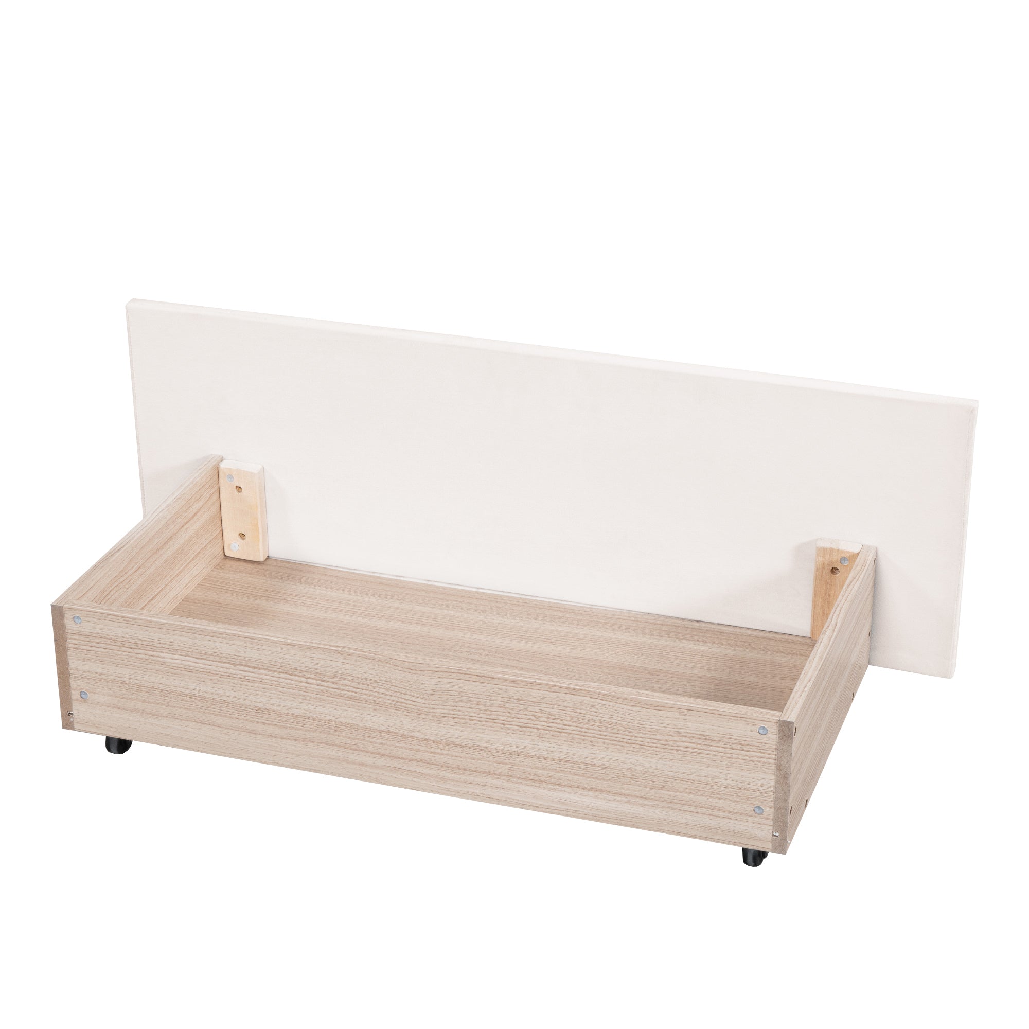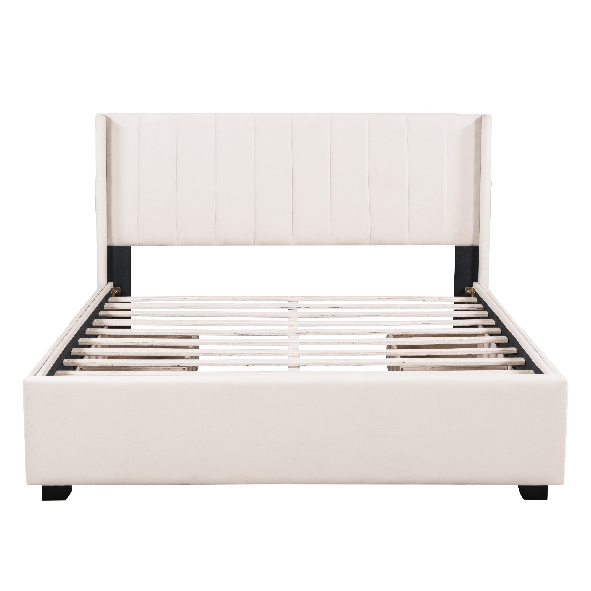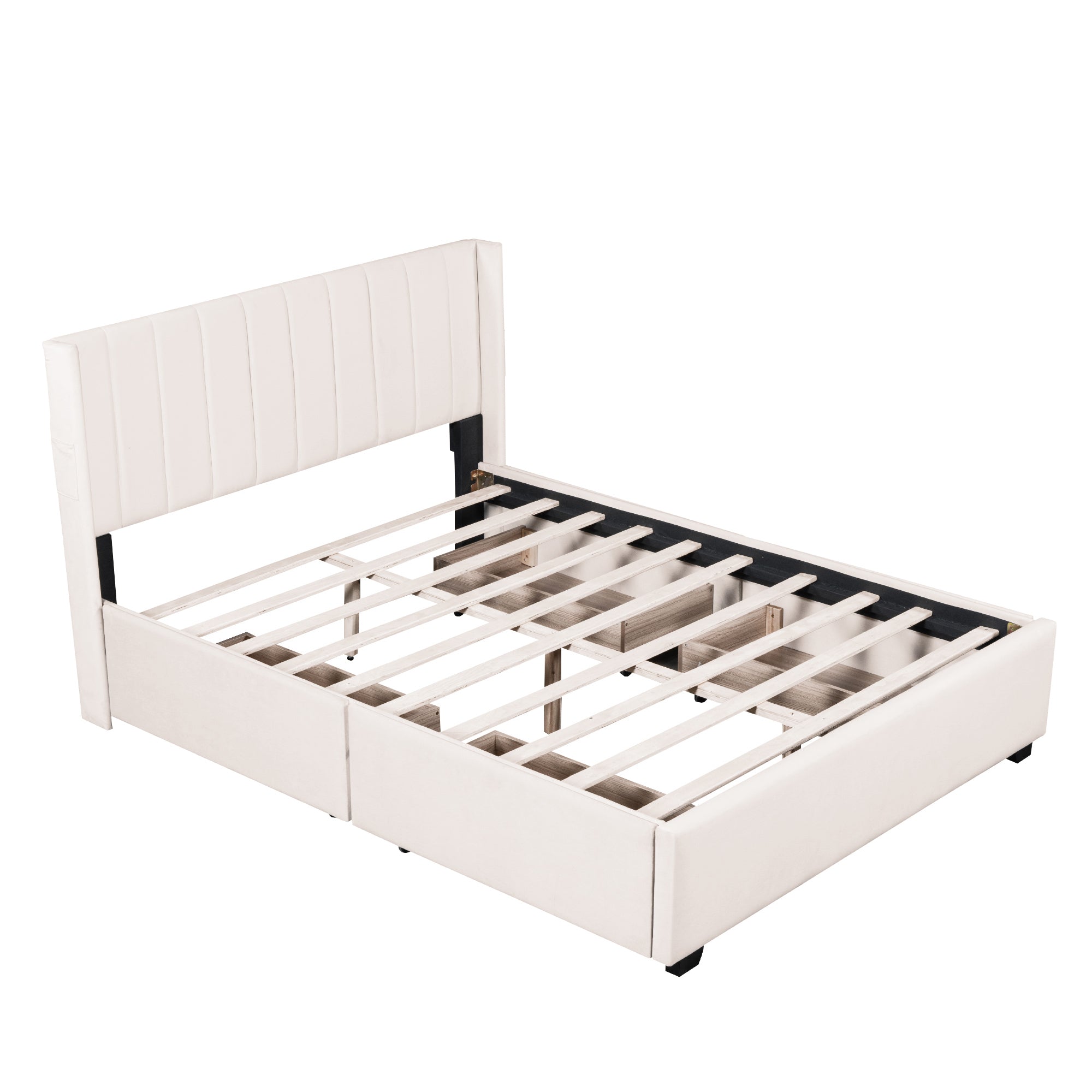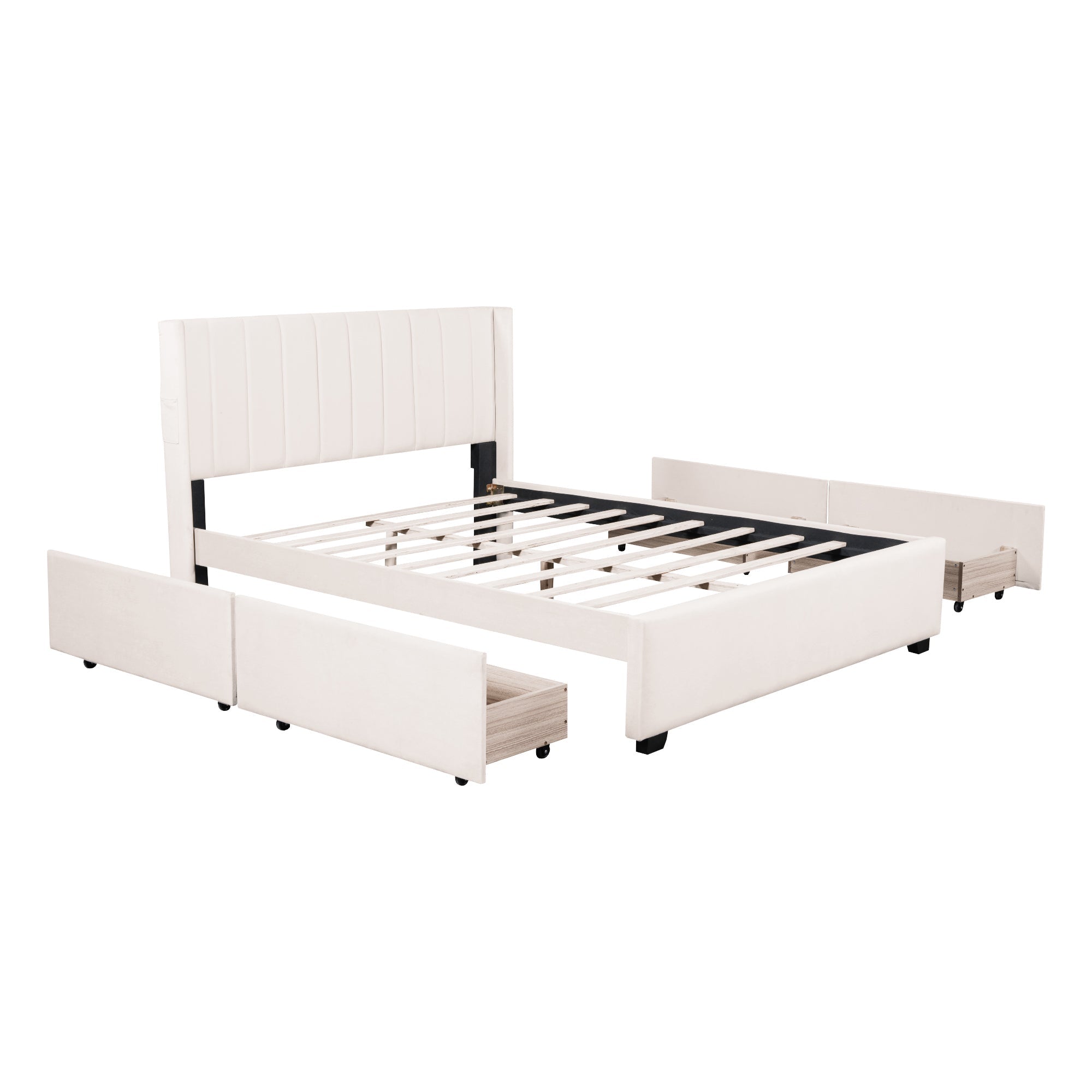 Velvet-Upholstered platform bed with beautiful finish has a sleek exterior profile, built-in headboard and footboard, with clean lines for a timeless look. There is 1 little pocket beside either side of the bed provides storage space for phones or remote, and makes the room tidy. This bed frame has four drawers with wheels for easy storage. Simply slide out the drawers to store extra bedding, clothes, or essentials right under your mattress. Enjoy a clutter-free space and the convenience of having everything within reach.