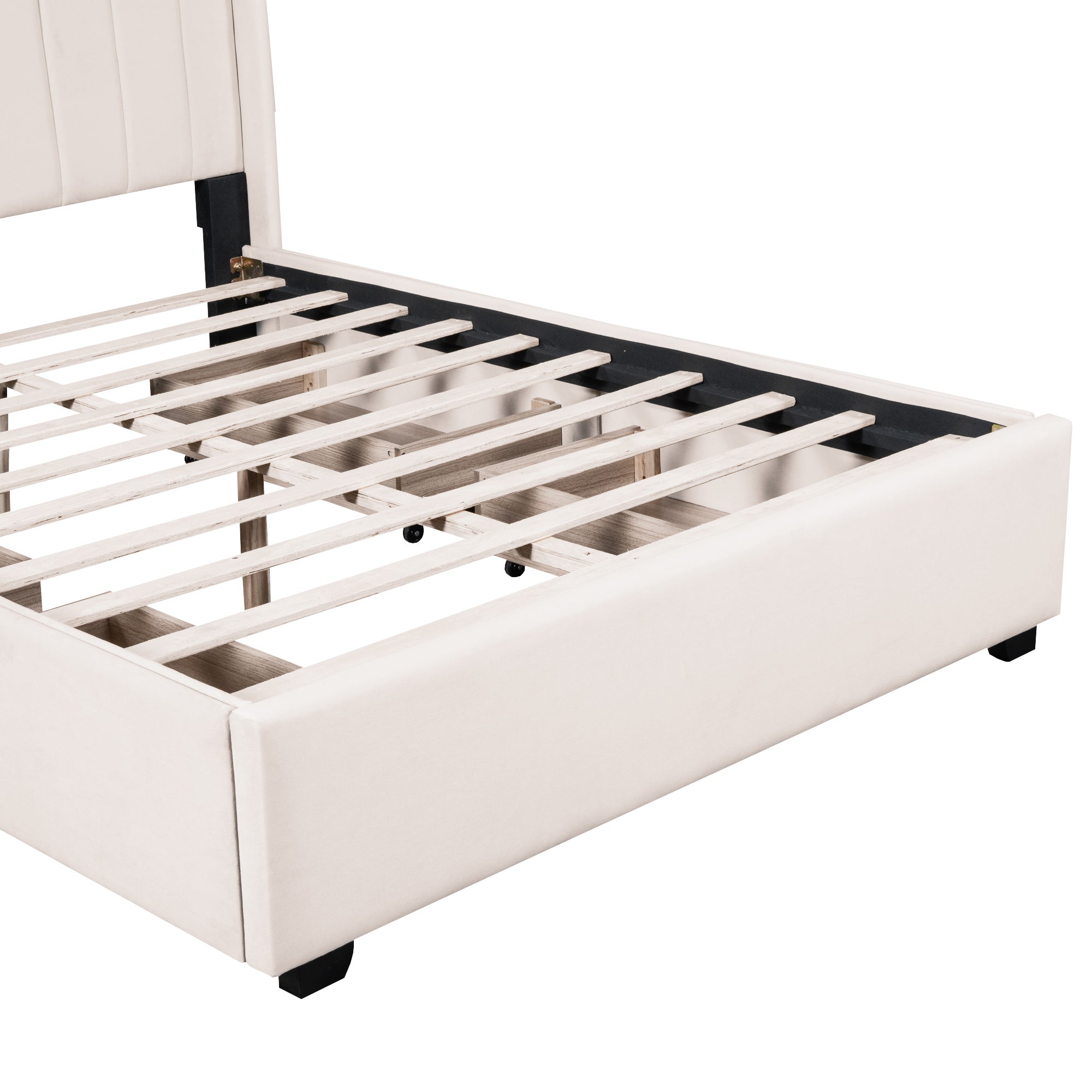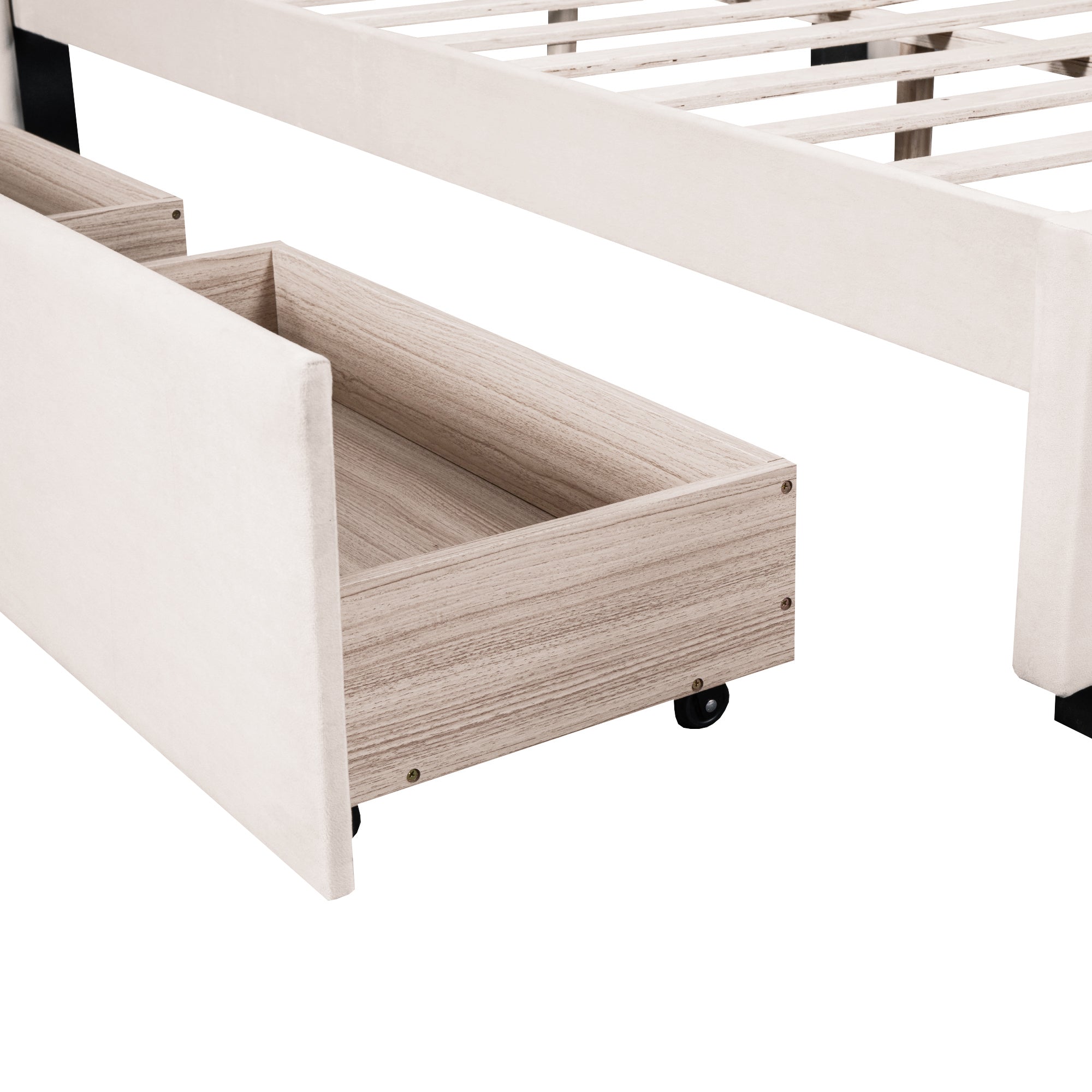 - [Storage space] This bed frame has four drawers with wheels for easy storage. Simply slide out the drawers to store extra bedding, clothes, or essentials right under your mattress. Enjoy a clutter-free space and the convenience of having everything within reach.