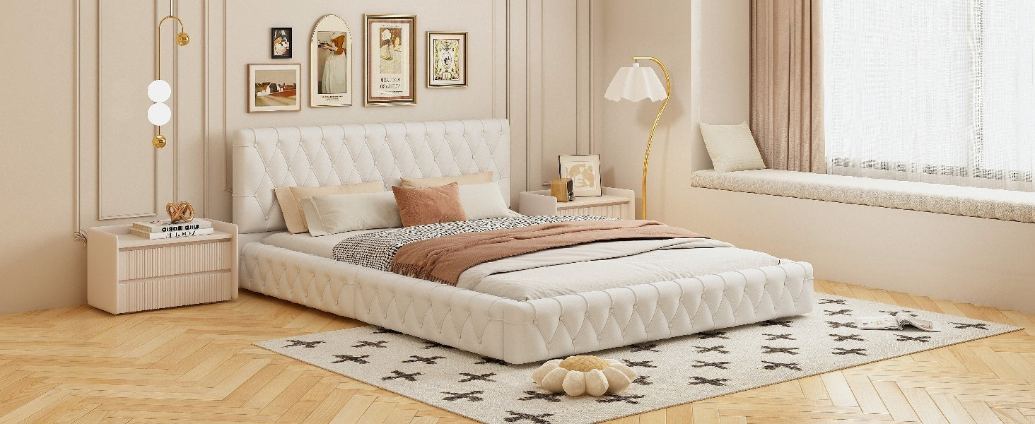 Queen Size Upholstered Bed with tufted headboard, Modern Velvet Platform Bed, White