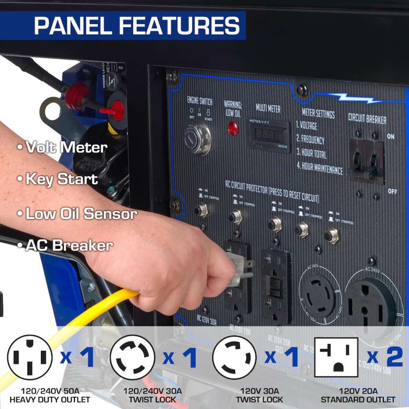 The XP15000E gasoline generator’s 15,000 watts of power will keep your entire house running during a storm or power outage. For maximum runtime, it has an extra big fuel tank and adheres to strict requirements to guarantee that these generators are as ecologically benign as possible. They are certified for usage in all 50 states by EPA and CARB. It also has several outlets, including a 50 amp outlet that is transfer switch ready, as well as a digital multimeter that displays voltage, frequency, and hours run.