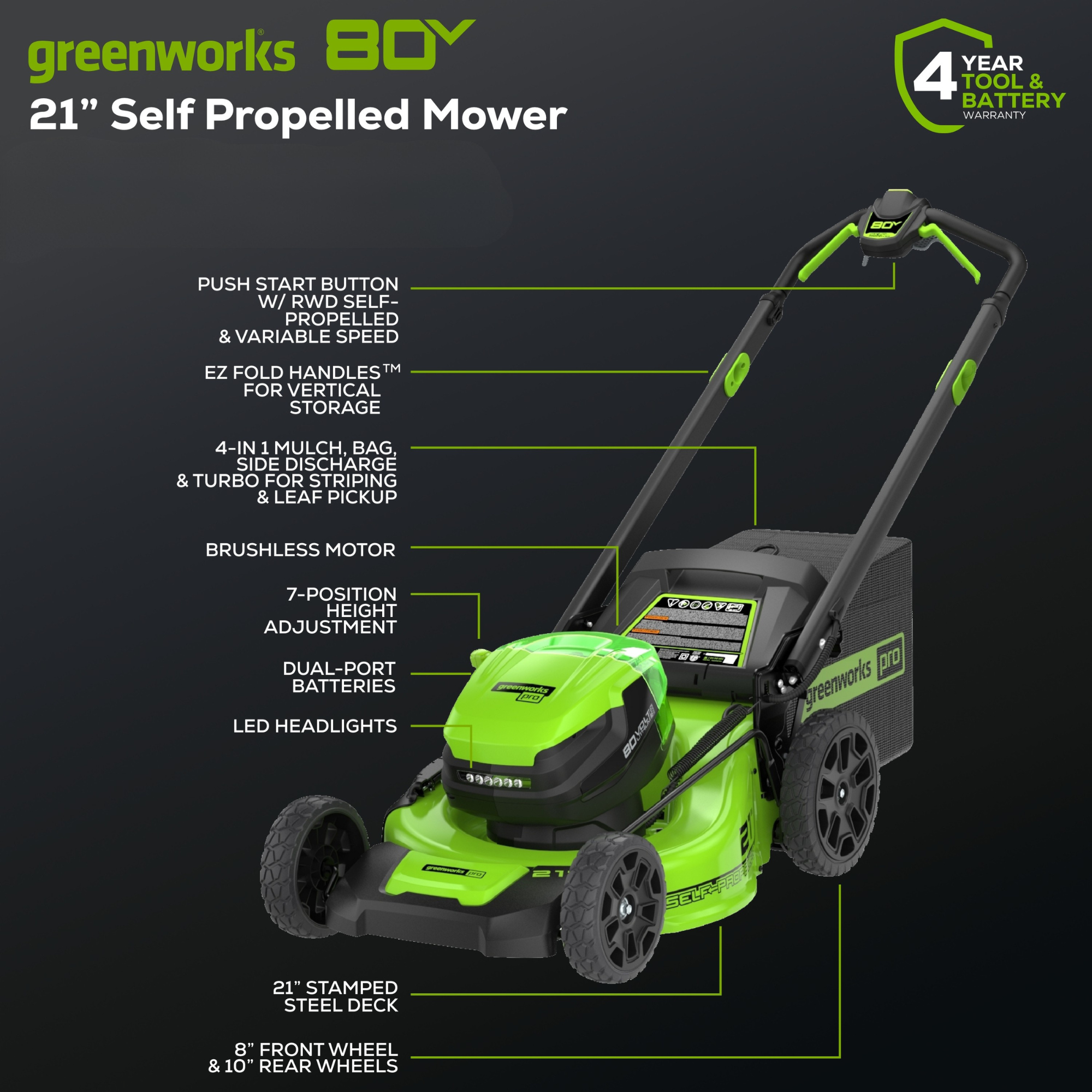 RENEWED 80V 21″ Cordless Battery 4-in-1 Self-Propelled Lawn Mower w/ Two (2) 4.0Ah Batteries & Rapid Charger