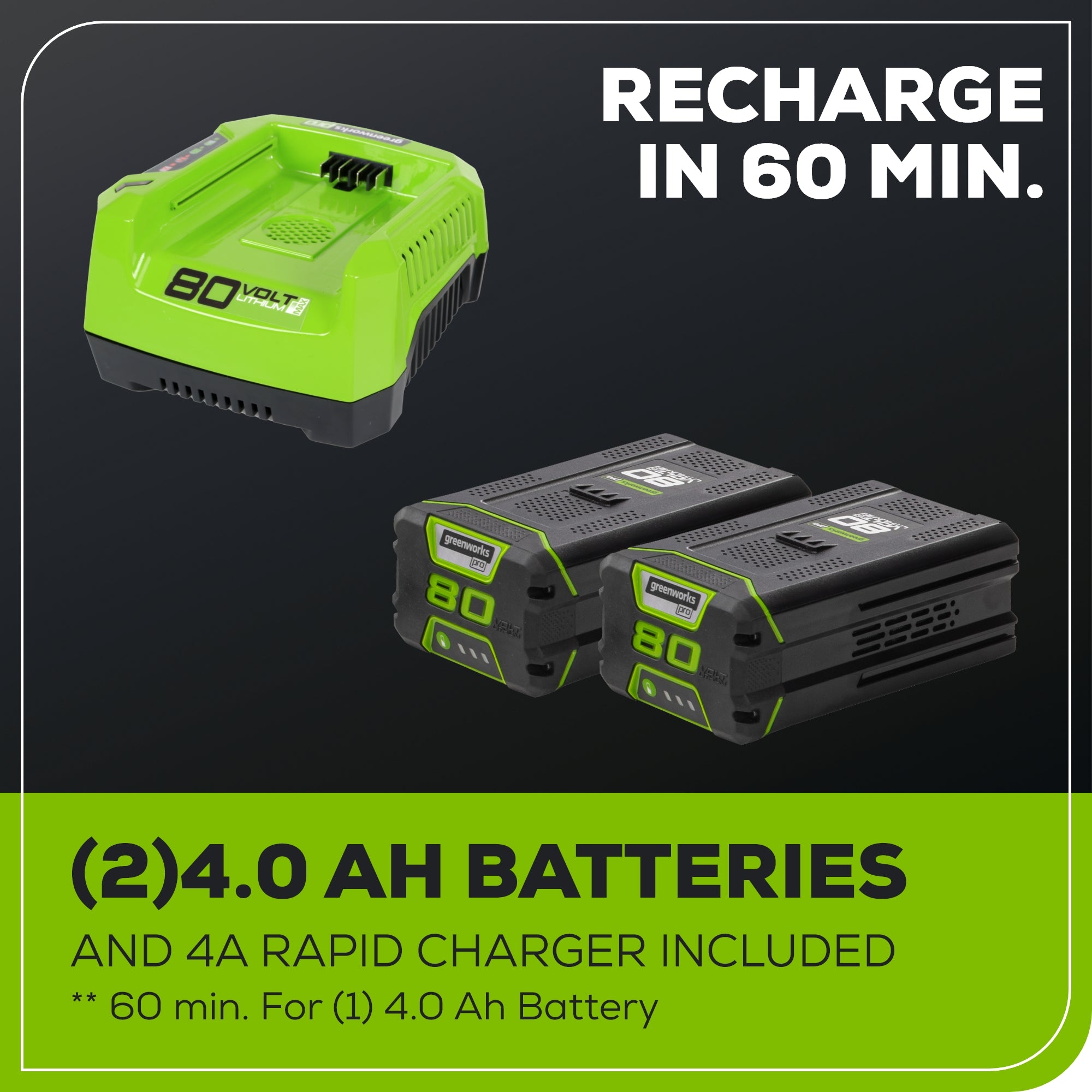 • Power 75+ Tools with any Greenworks 80V Battery