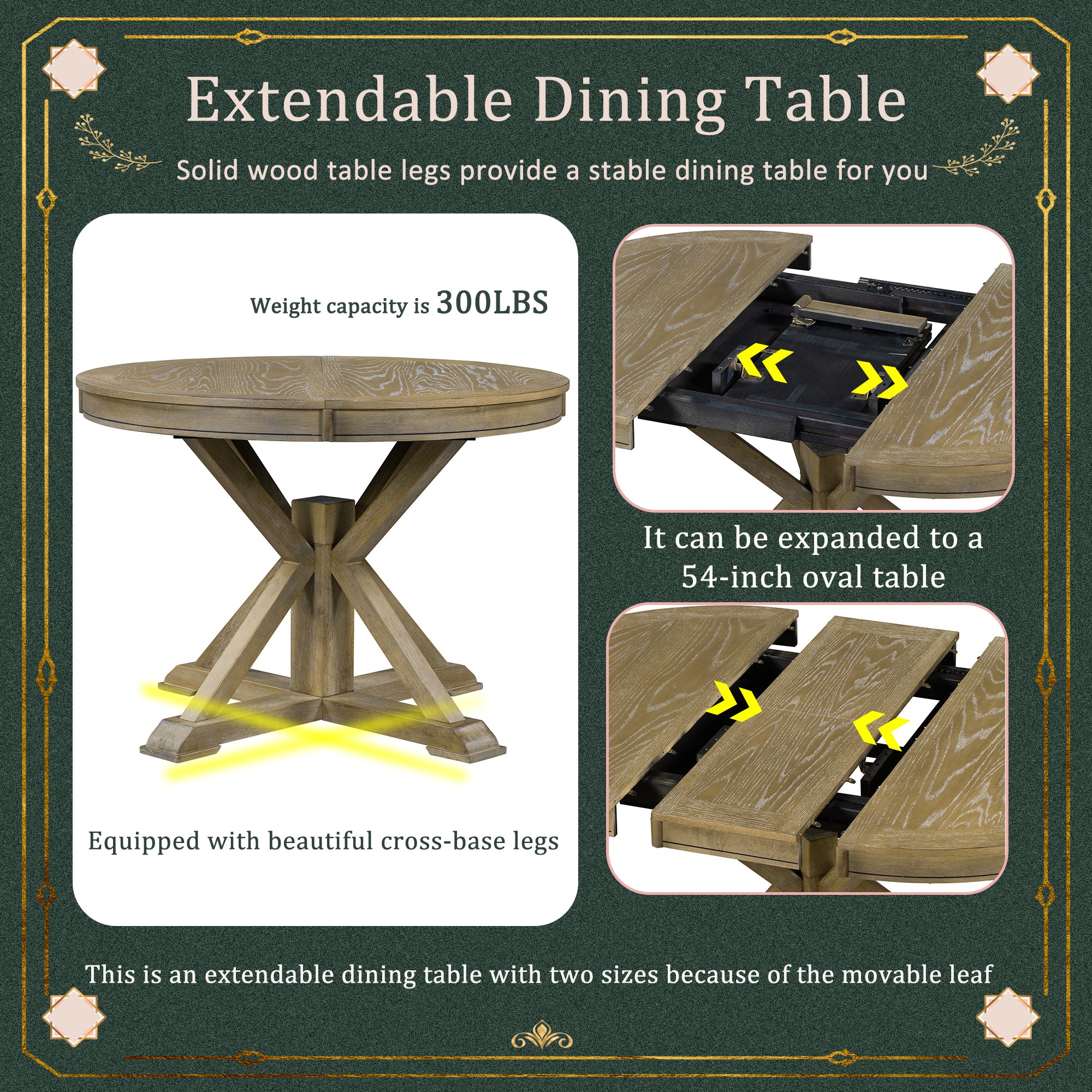 • Premium Quality: OAK veneer tabletop has silk pressing pattern. Solid wood cross-base table legs provide a stable dining table for you, ensuring the stability and durability, so you and your family can take a gathering safely. The table weight capacity is 300 LBS.