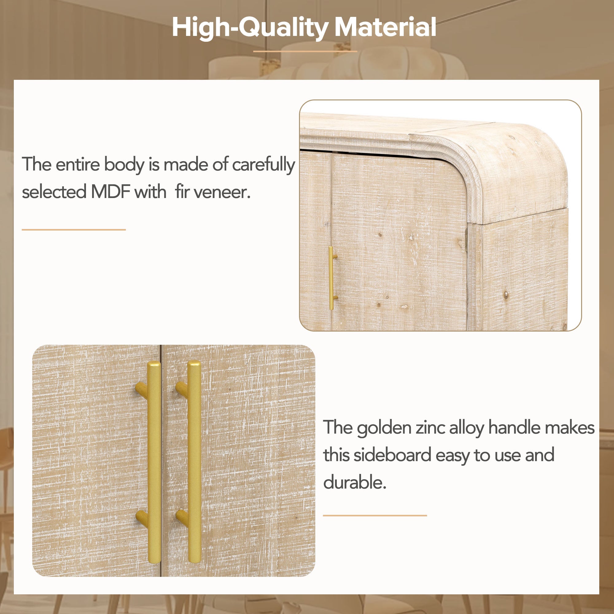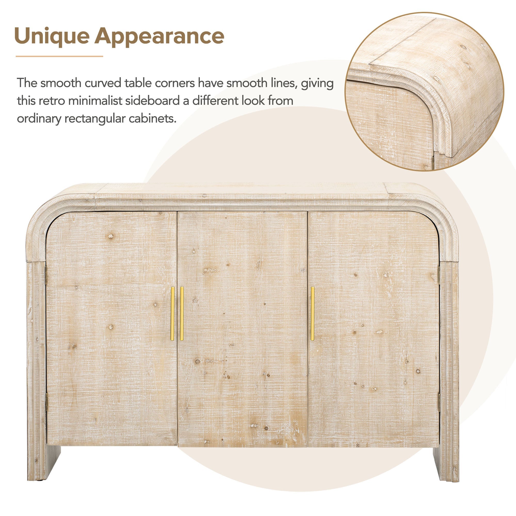 • Unique Appearance: This retro minimalist sideboard has a different appearance than ordinary rectangular cabinets. The table corners are smooth and curved, and the lines are smooth, making the overall look more high-end. The natural finish of the wood plus the gold linear pulls make this table even more elegant and sophisticated.