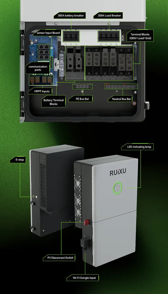 The RUiXU RX-12K is a high-performance split-phase hybrid inverter designed for residential, commercial, off-grid, and backup power applications. It seamlessly integrates solar power, battery storage, and grid energy, delivering reliable and efficient energy management.