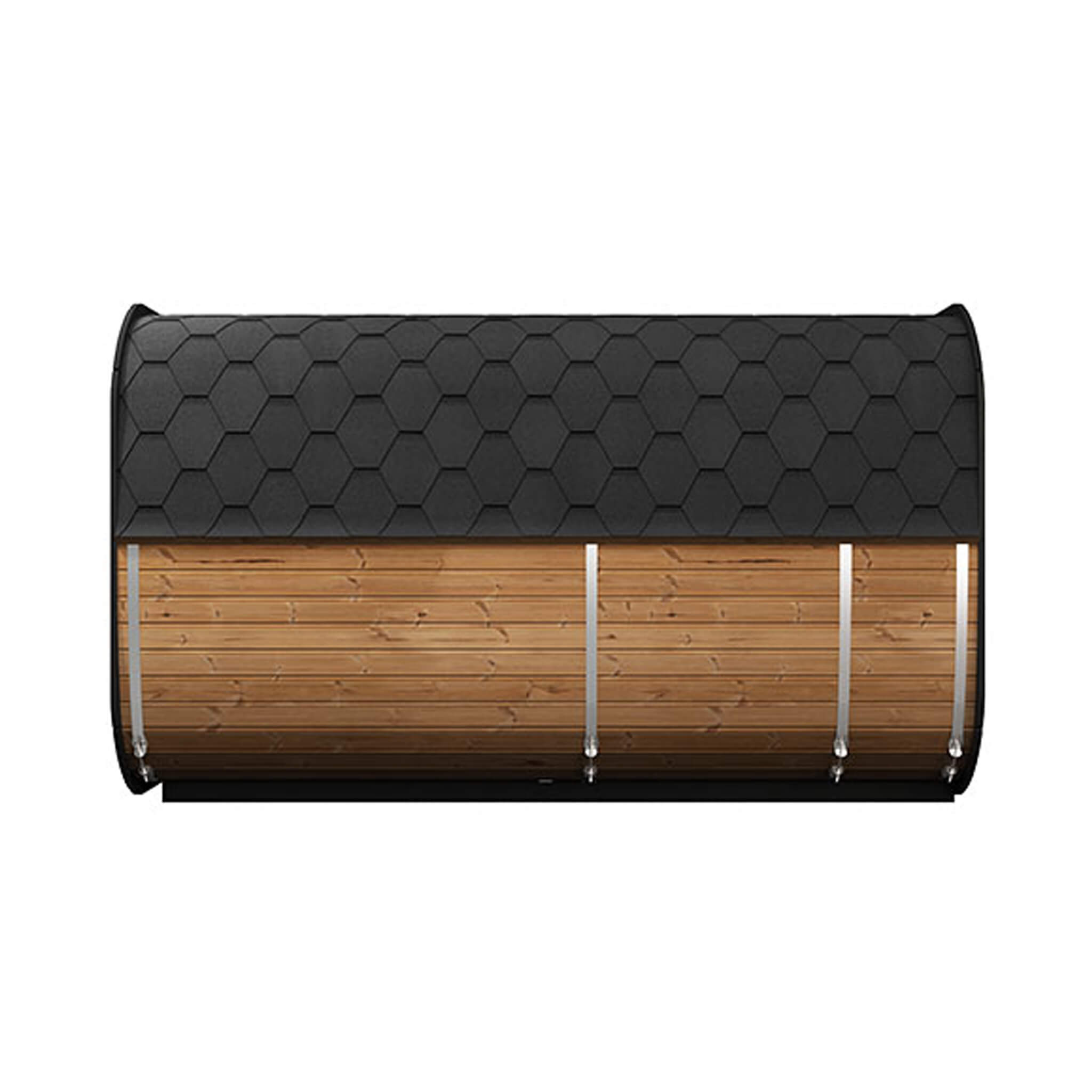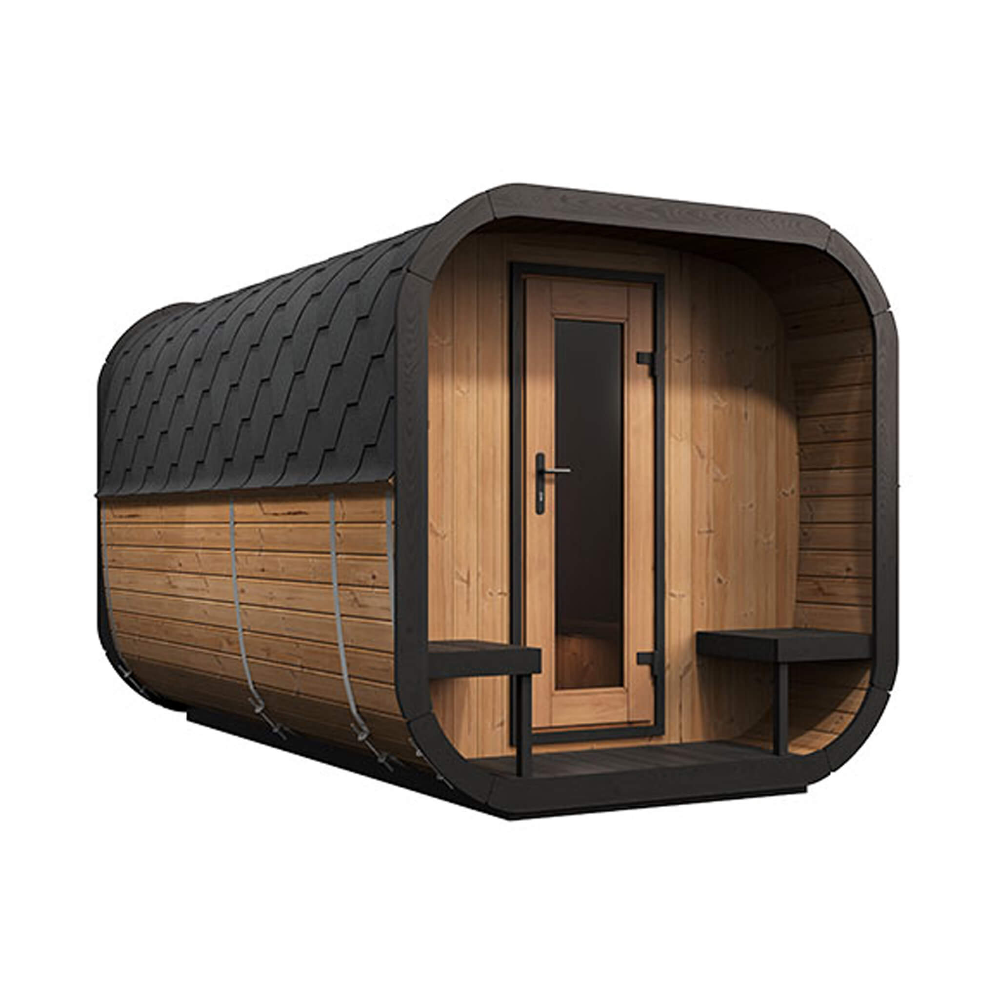 - Relax on the front porch with built-in seating and enjoy the convenience of an integrated dressing room in this spacious outdoor sauna.