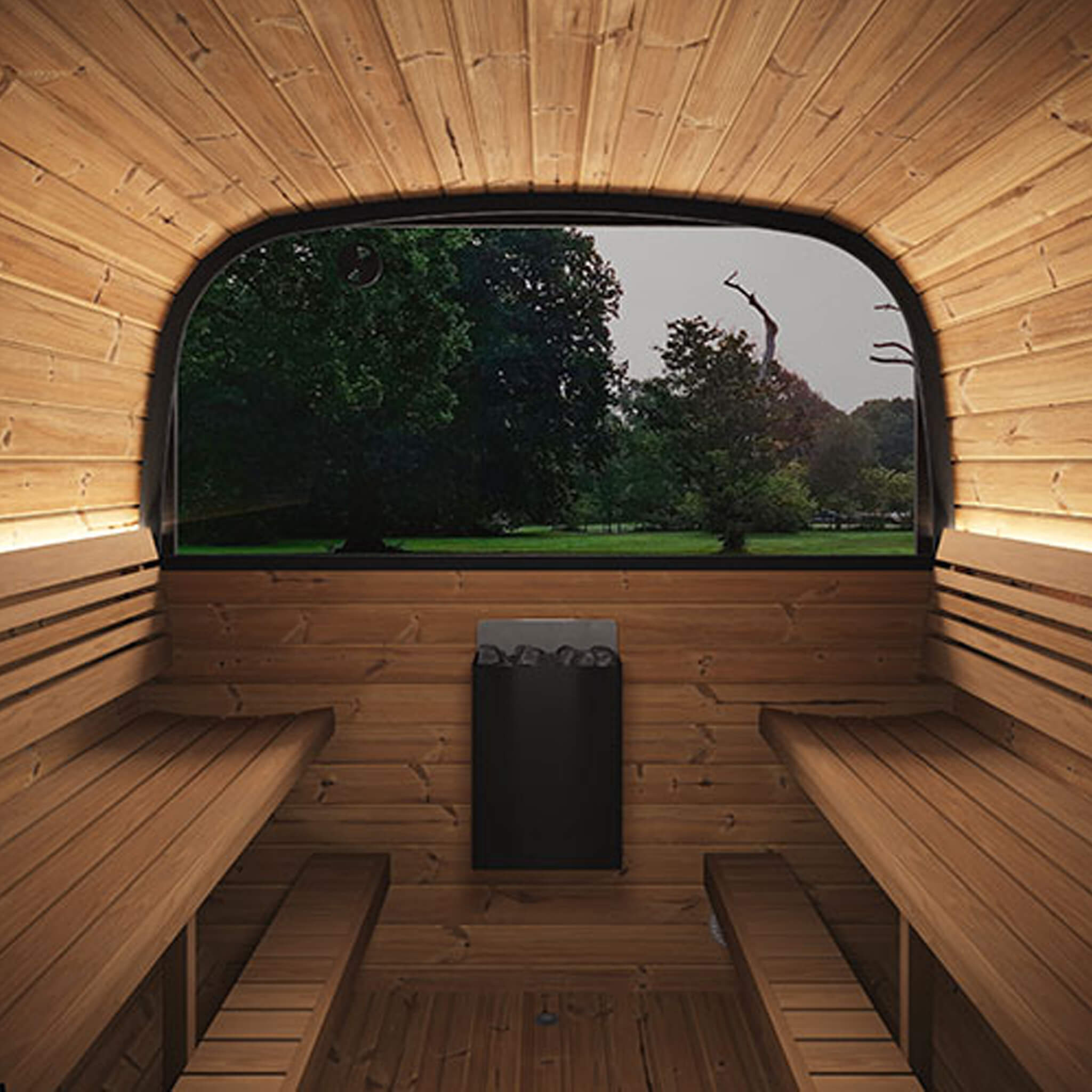 - Enjoy natural light and a clear view with the sauna’s large tempered glass window.