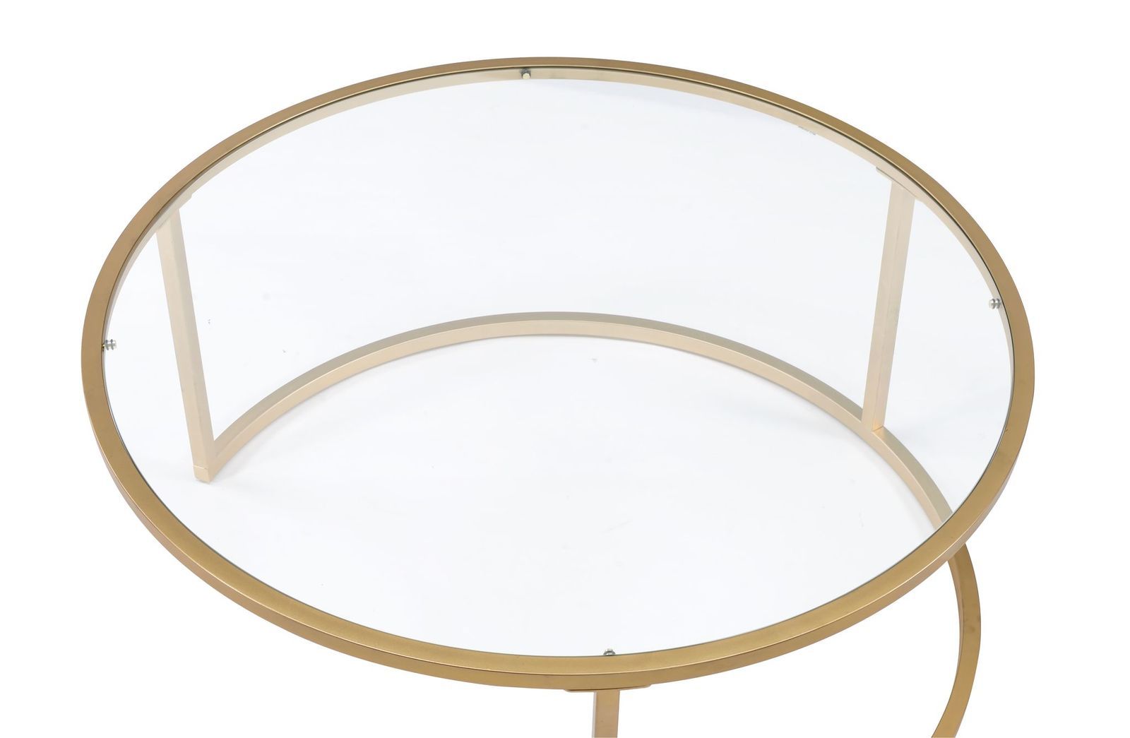 Entertain in style with the Shanish Coffee Table Set. This distinctive two-piece occasional table set showcases intertwining tables with a gold finished metal base that nestles together or can separate for additional entertainment and display space. This unique round coffee table set features one large table with glass top and a smaller table with faux marble top and is a must-have accent piece for your home. Use it to add a touch of contemporary flair to a traditional space or to simply complete a modern aesthetic.