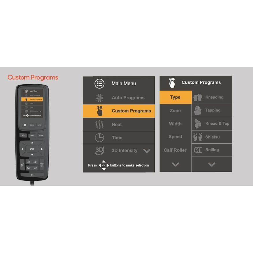 | Custom Massage | Create your own massage sequence by selecting back massage techniques plus desired airbag zones and intensities. Add heat and music for a session all your own |