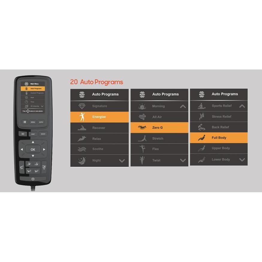 | 20 Auto-Programs | Choose the auto program that fits your mood — Energize, Soothe, Sports relief, Zero G are just a few of the programs available for energizing and relaxing day or night |