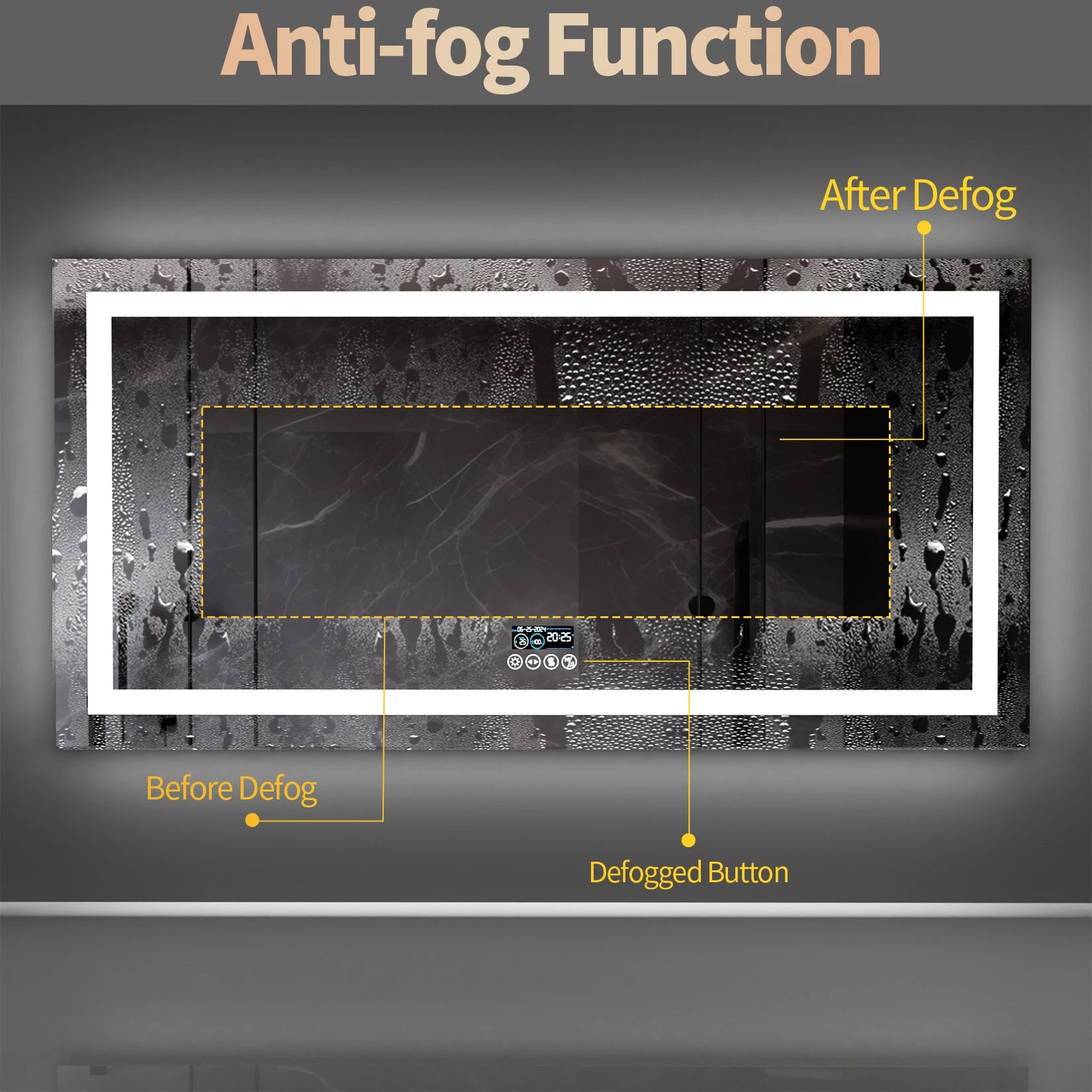 Anti-fog System & Memory Function: The smart mirror features a memory function, which means when you turn on the switch, the mirror will restore the lighting and brightness last used, saving you time, no need to readjust the lights again, then built-in demister pads eliminate large patches of steam on your mirror, works within 3-4 minutes when taking a shower, keeps the mirror fog free and always clear images, four buttons on the screen to independently control the on/off & brightness, lighting colors, defog system and music.