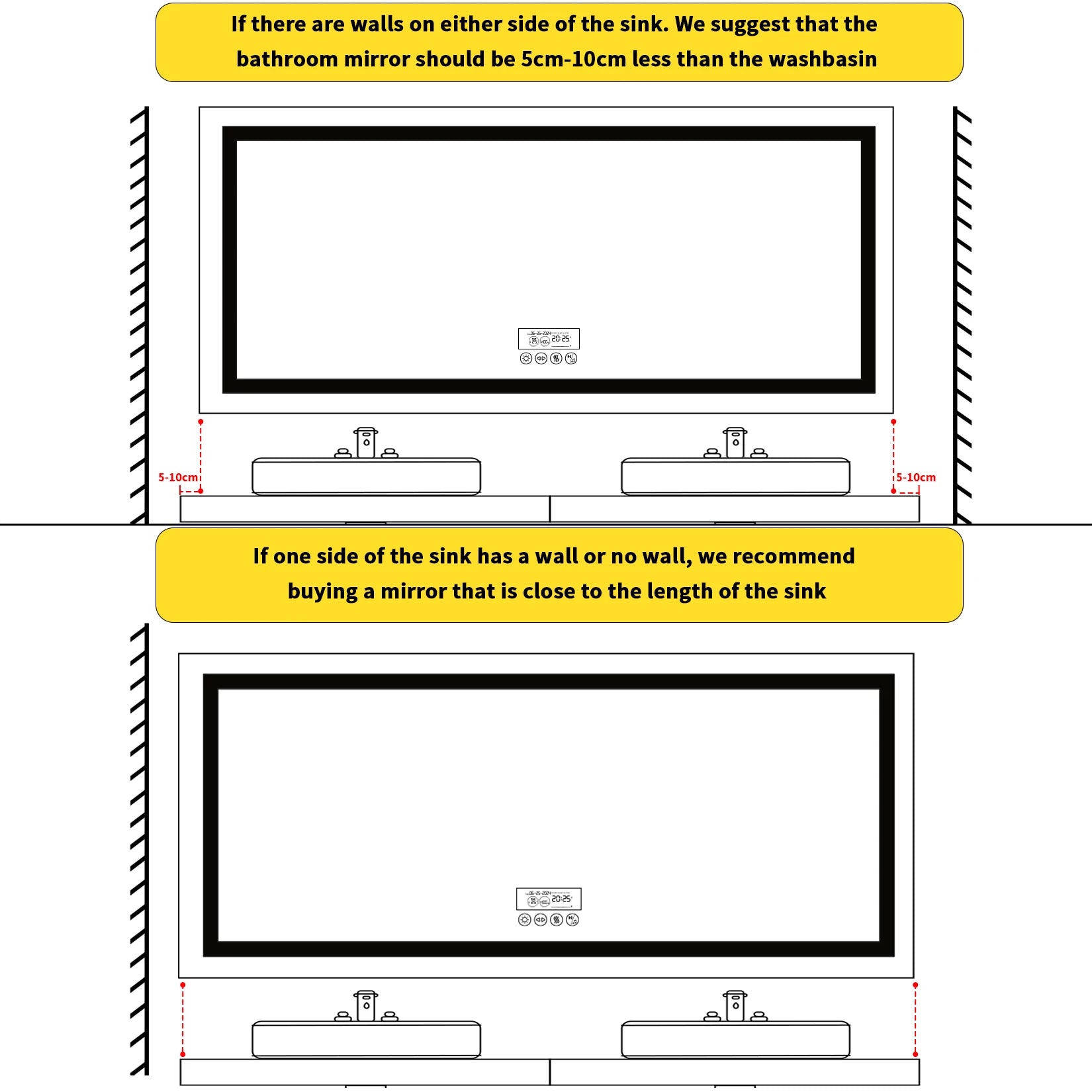 This Smart Intelligent Technology Function LED Vanity Mirror is the first one to combine dimming brightness, color settings, date and time, temperature, and anti-fog in one kind, you can know the time and temperature easily when you apply makeup or dress up, the mirror has dual led light strips, both front-lit and back-lit, giving more illumination for makeup or shaving applications, long press the second button to adjust the brightness from 20% to 100% according to your needs, it means that the pace of life is in your hands, enjoying more convenience with this smart mirror.
