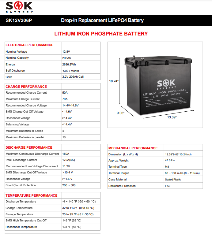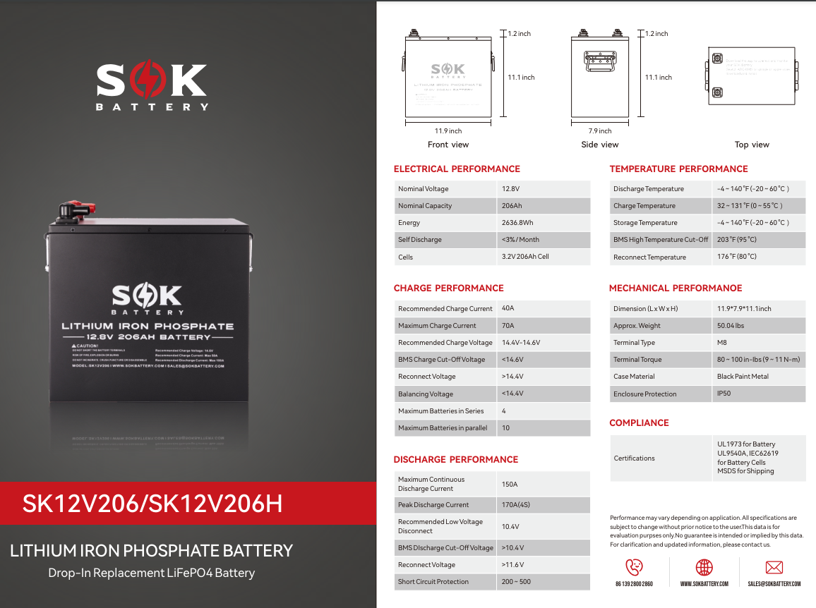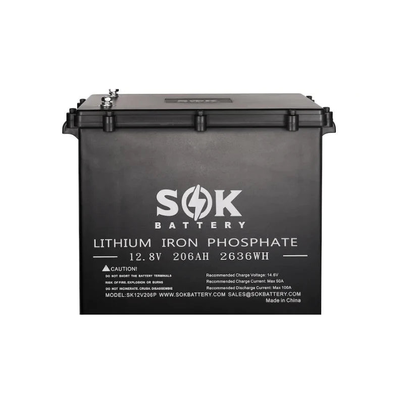 SOK Battery 12V 206Ah LiFePO4 Battery Bluetooth & Built-in Heater (SK12V206H) | 12V 206Ah Marine Grade LiFePO4 Battery in Sealed Plastic (SK12V206PH)