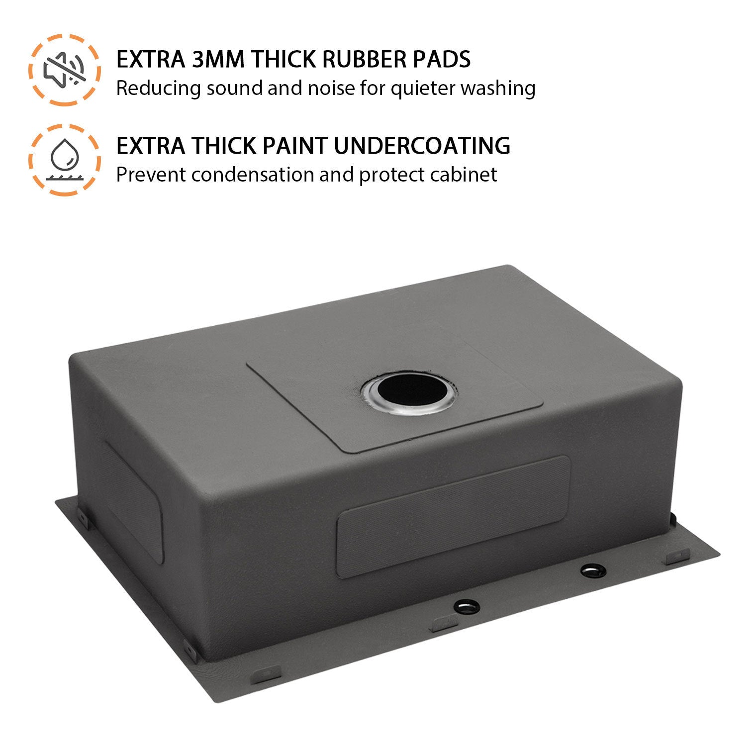 - 3 mm sound guard undercoating and thick rubber padding to minimize noise, this kitchen sink boasts tougher bulk, finer details, greater capacity.