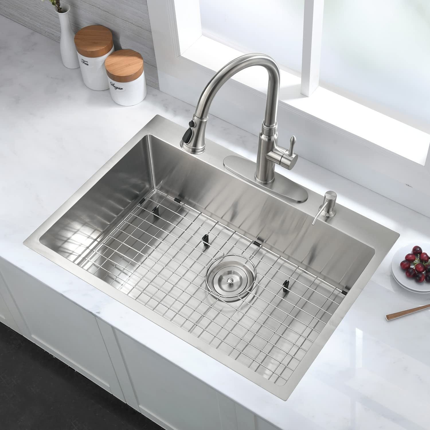- Package include:1 x 30 inch sink bowl; 1 x roll mat; 1 x 3.5″ drainer; 1 x bottom grid.