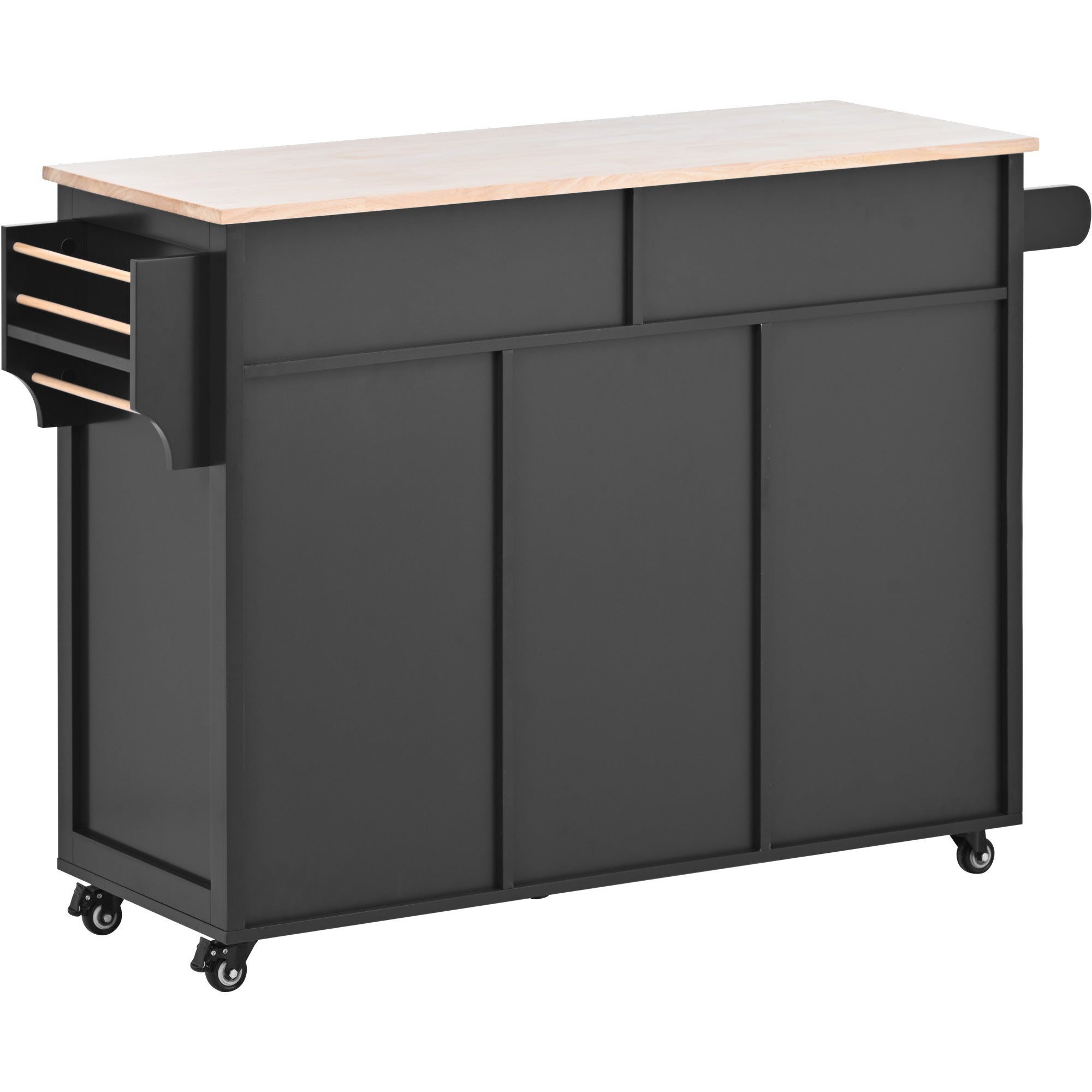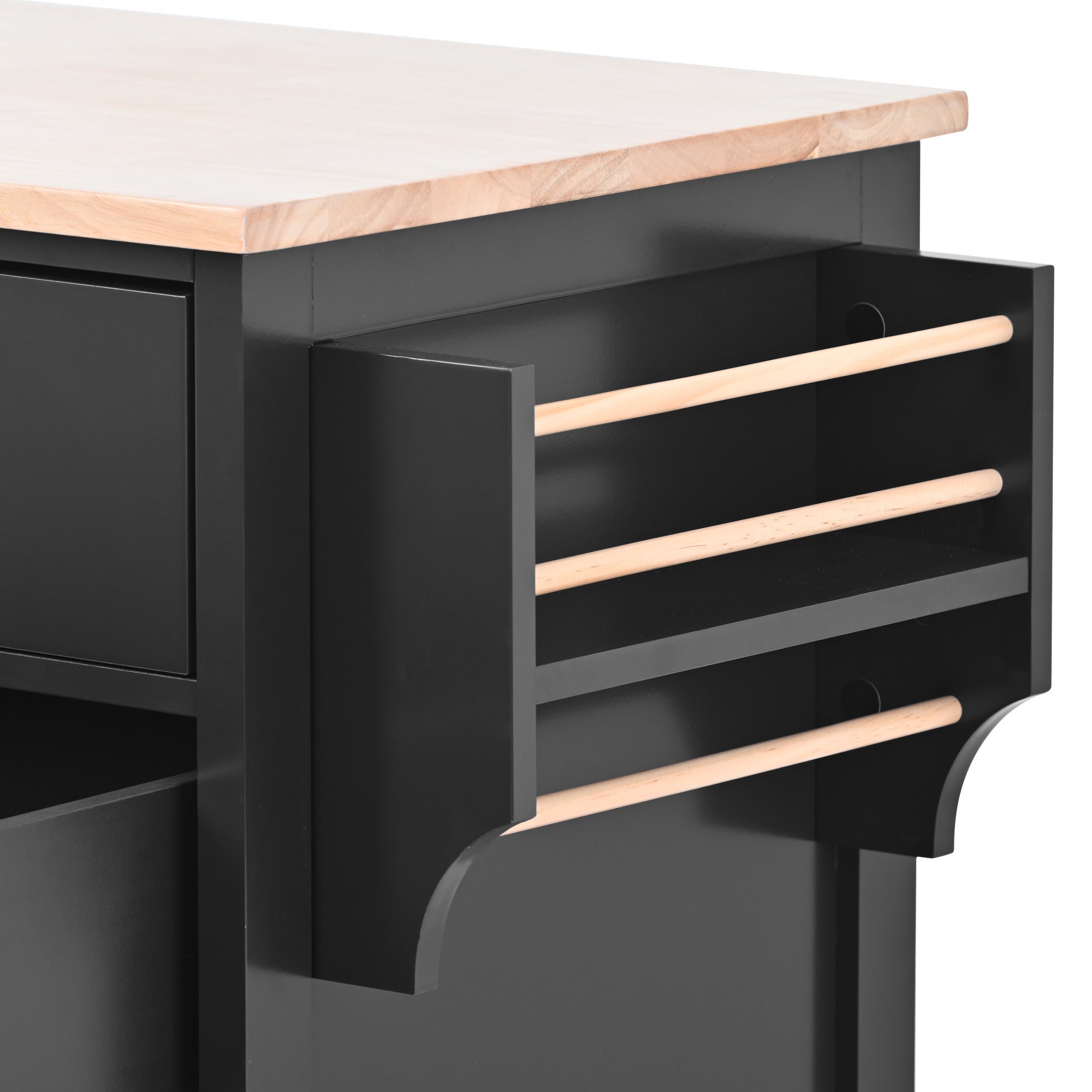 This kitchen island has 8 handle-free drawers that prevent the handles from falling off and kids from eating them,which provide endless organizational possibilities.Rubber wood top is ideal for Microwave oven, coffee machine, beverage cabinet and other daily essentials, keeping them in your reach.