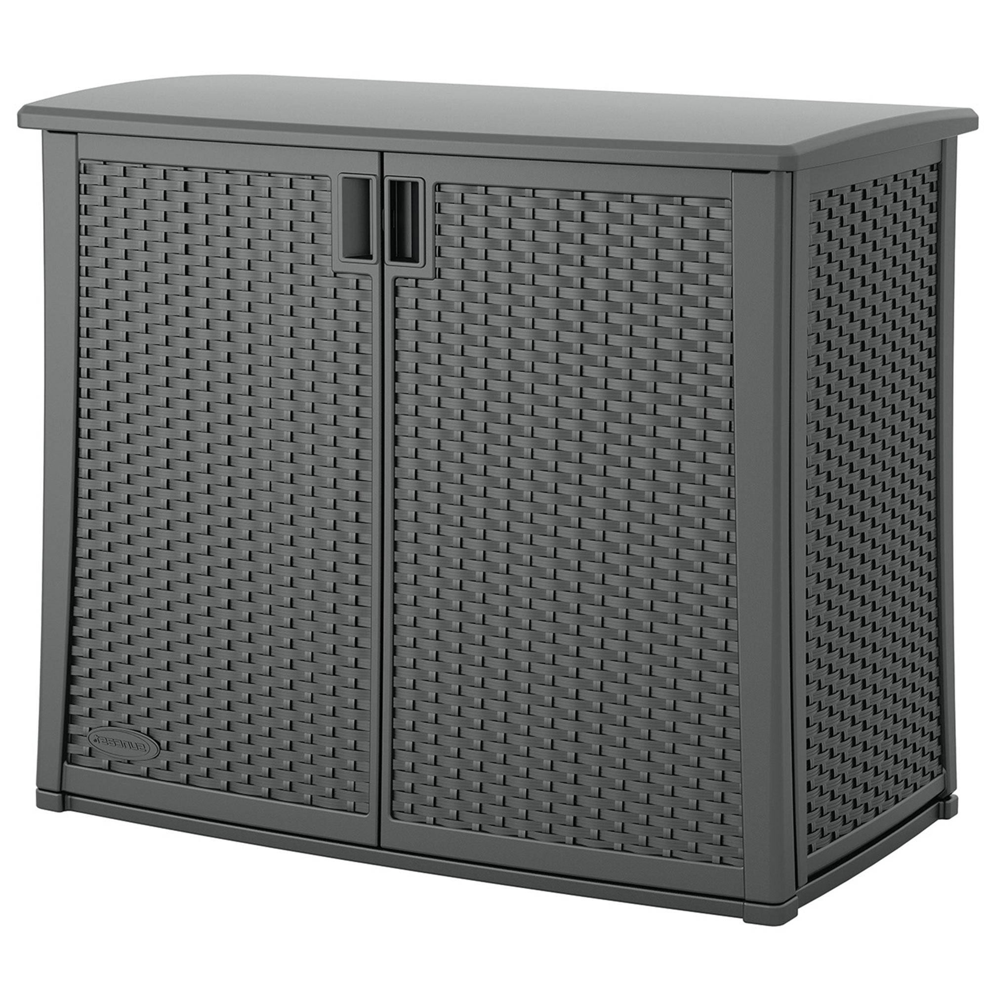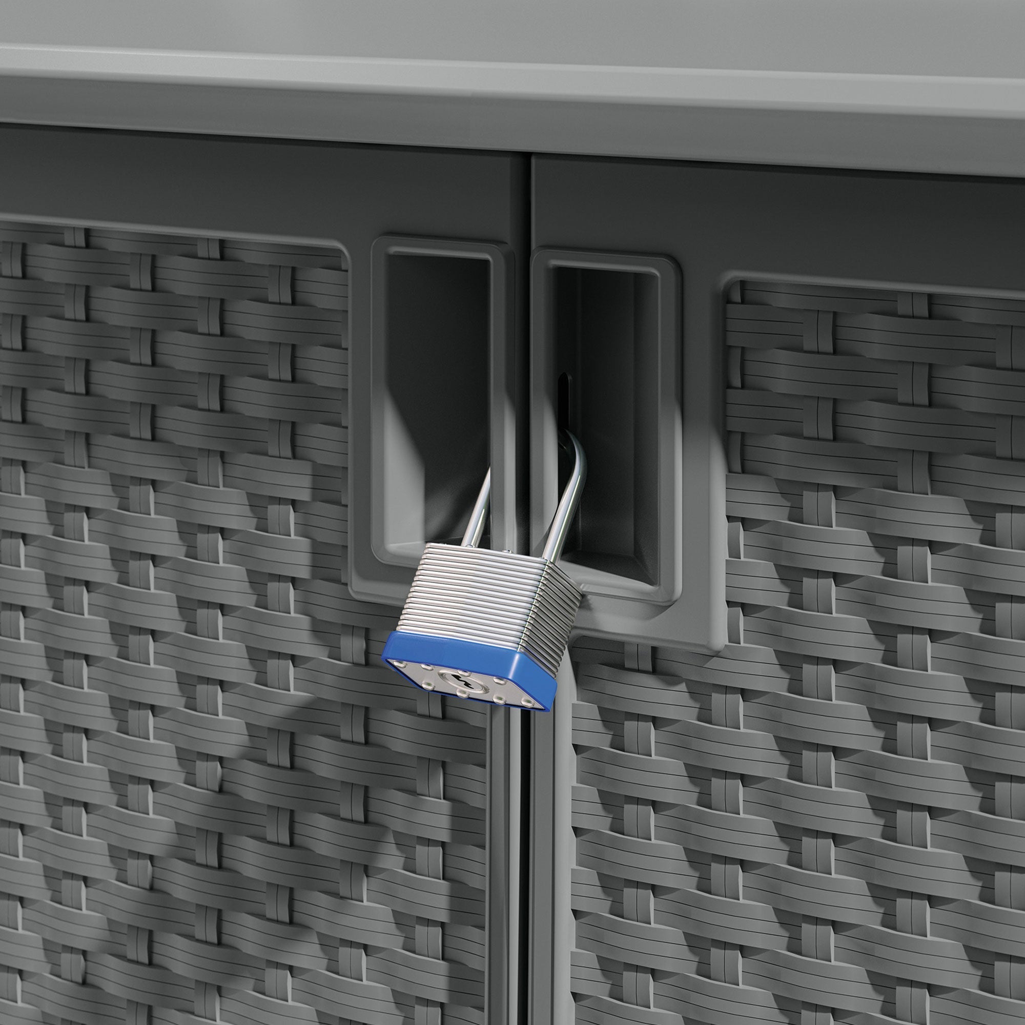 Offering a 97-gallon interior capacity, these cabinets are large enough to accommodate lawn and garden tools, grill accessories, and more. The included metal-reinforced, adjustable shelves further increase your organizational opportunities. Durable plastic construction is accented by sturdy, pad-lockable doors that provide superior strength and security (lock not included) and the wicker design looks great in any outdoor setting.