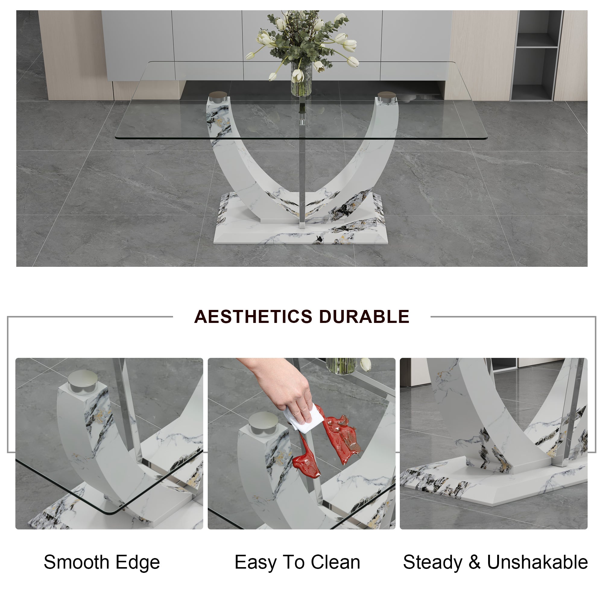 - Large modern simple rectangular glass table, which can accommodate 6-8 people, equipped with 0.39-inch tempered glass table top and large MDF table legs,used for kitchen, dining room, living room