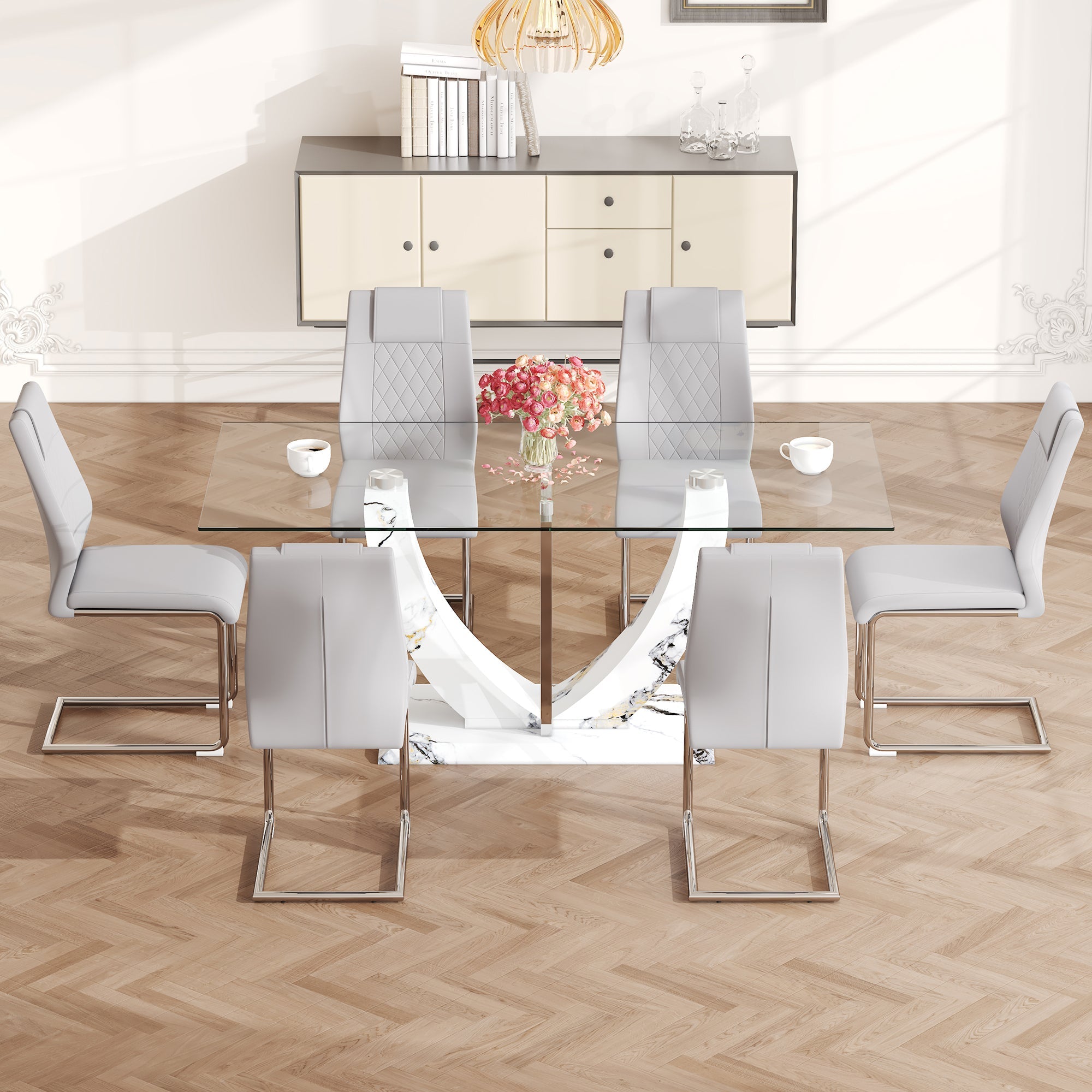 Be the first to review “Table and chair set, large modern rectangular glass table, can accommodate 6-8 people, equipped with a 0.39-inch tempered glass tabletop and MDF table legs.Paired with comfortable and soft chairs.” Cancel reply