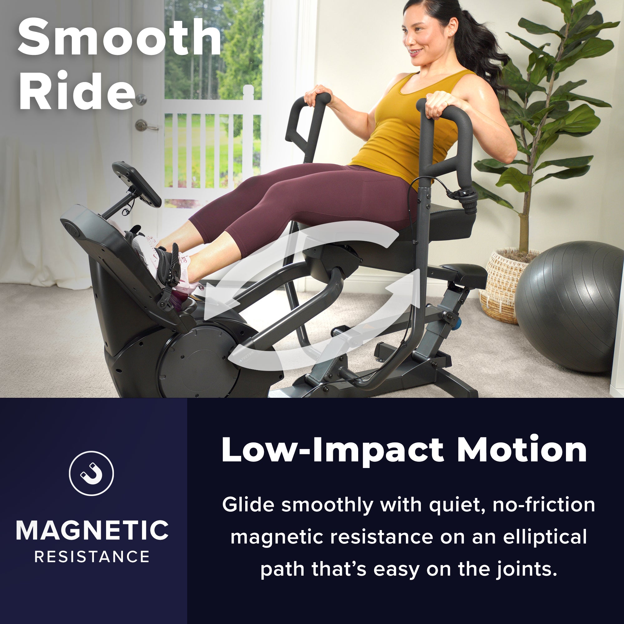 The high-intensity Power10 Elliptical Rower redefines rowing to deliver a better cardio and strength workout. 2-way resistance alternates working and resting muscles to maintain intensity and maximize calorie burn. With the easy-access resistance selector, you can adjust the intensity of your workout at any time without having to stop. Multi-grip handles allow variable muscle targeting in the upper body so you can get a head-to-toe sweat going! Track your heart rate on the digital performance monitor with the included Bluetooth-enabled HRM chest strap.