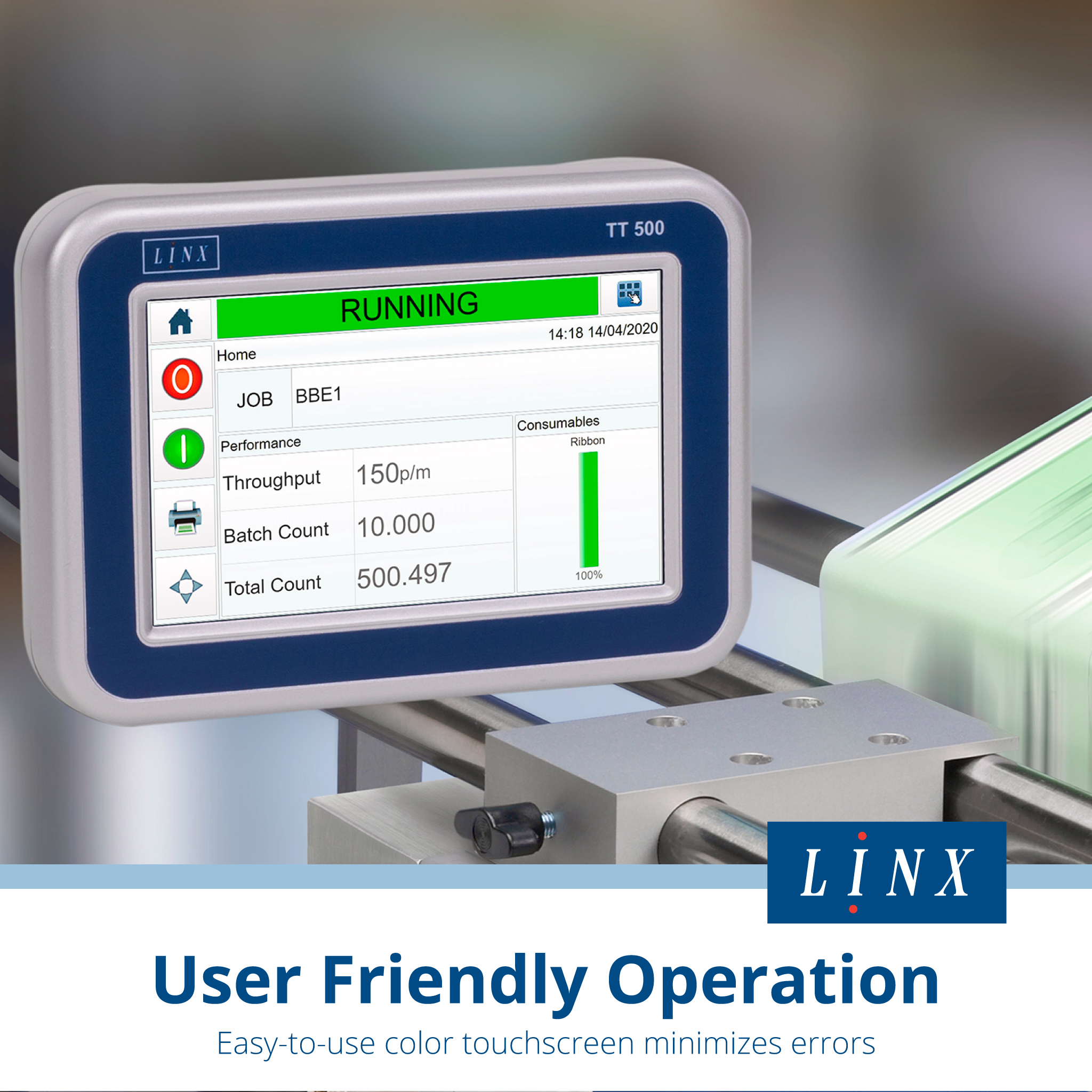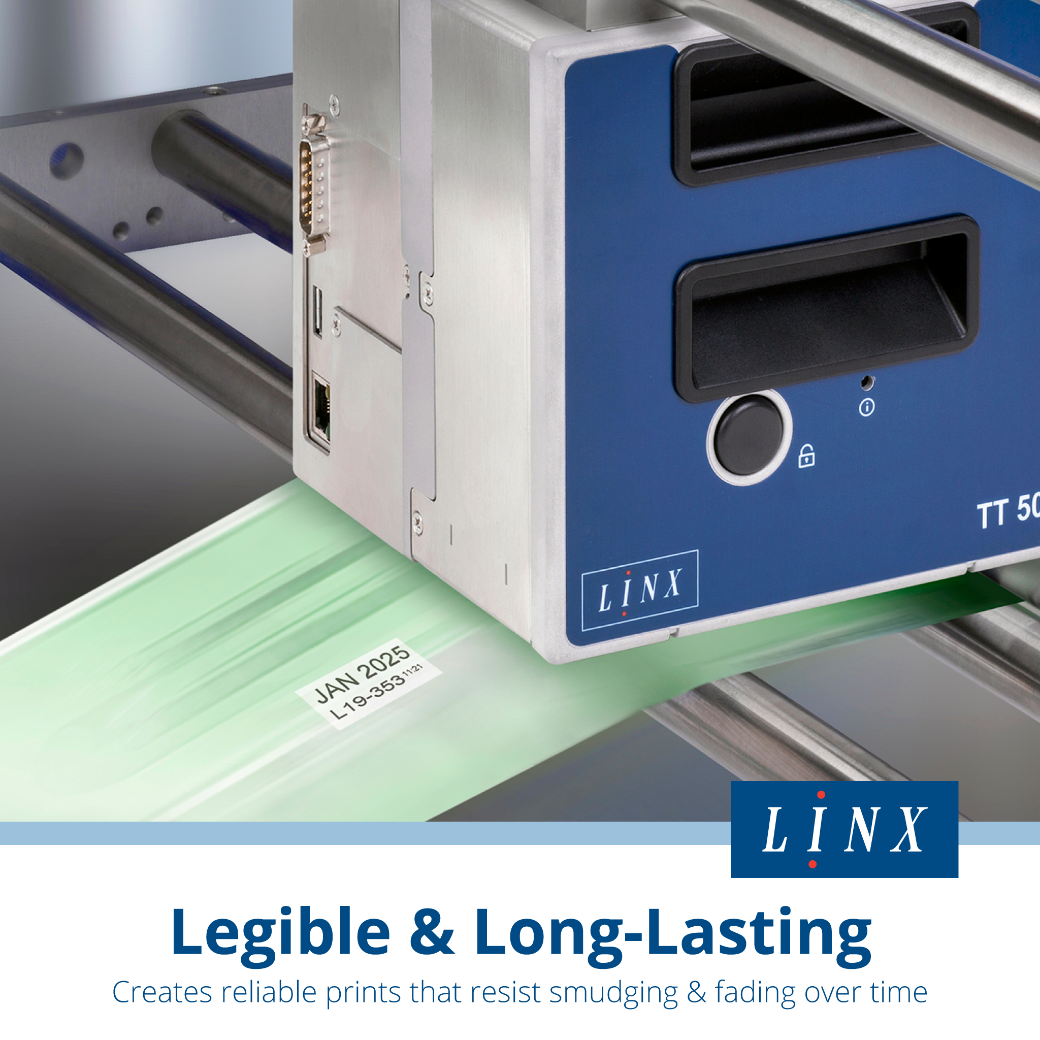 The TT500 series of thermal transfer overprinting machines provides an ideal printing solution onto flexible packaging across a wide variety of industrial applications. It is built for maximum convenience and equipped with an advanced motor drive that enables operation without compressed air. Designed to deliver a low total cost of ownership and increase your production line output, these TTO coders are particularly suitable for printing consistent, error-free best-before dates, batch codes, barcodes, ingredients, logos, and other product information.