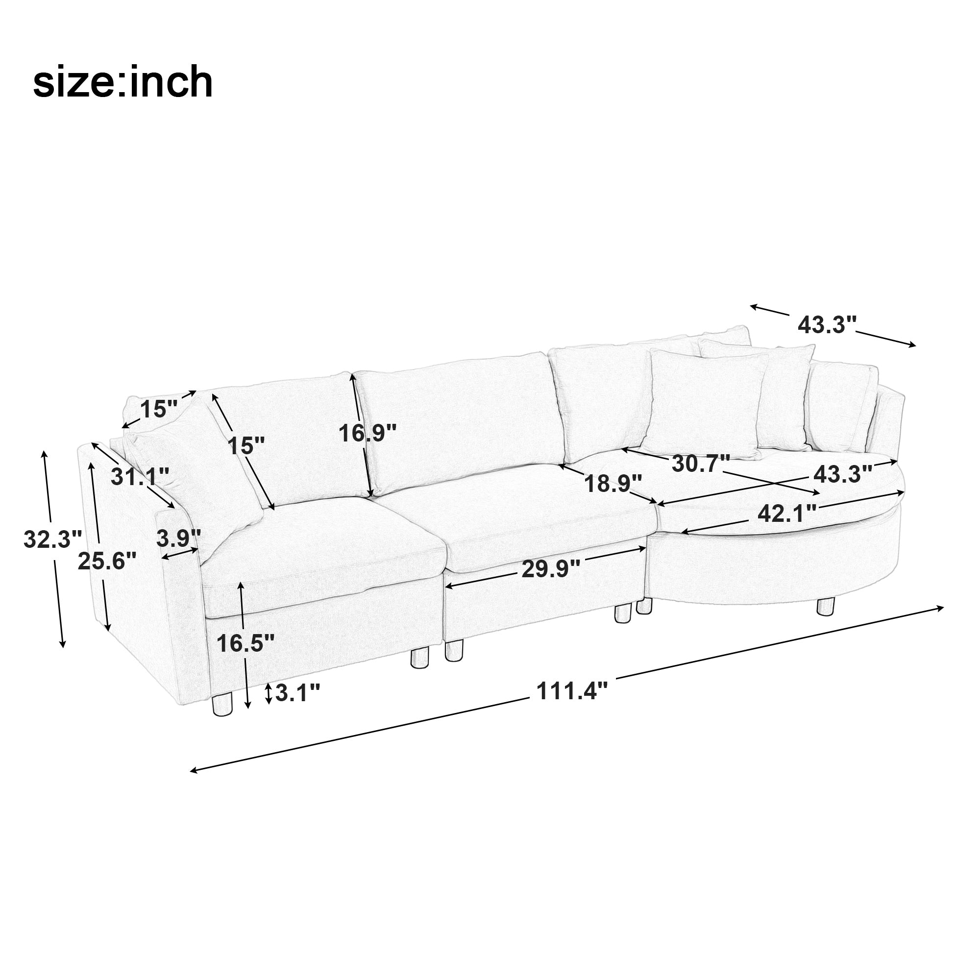| Overall | 111.4”Wx43.3”Dx32.3H” |