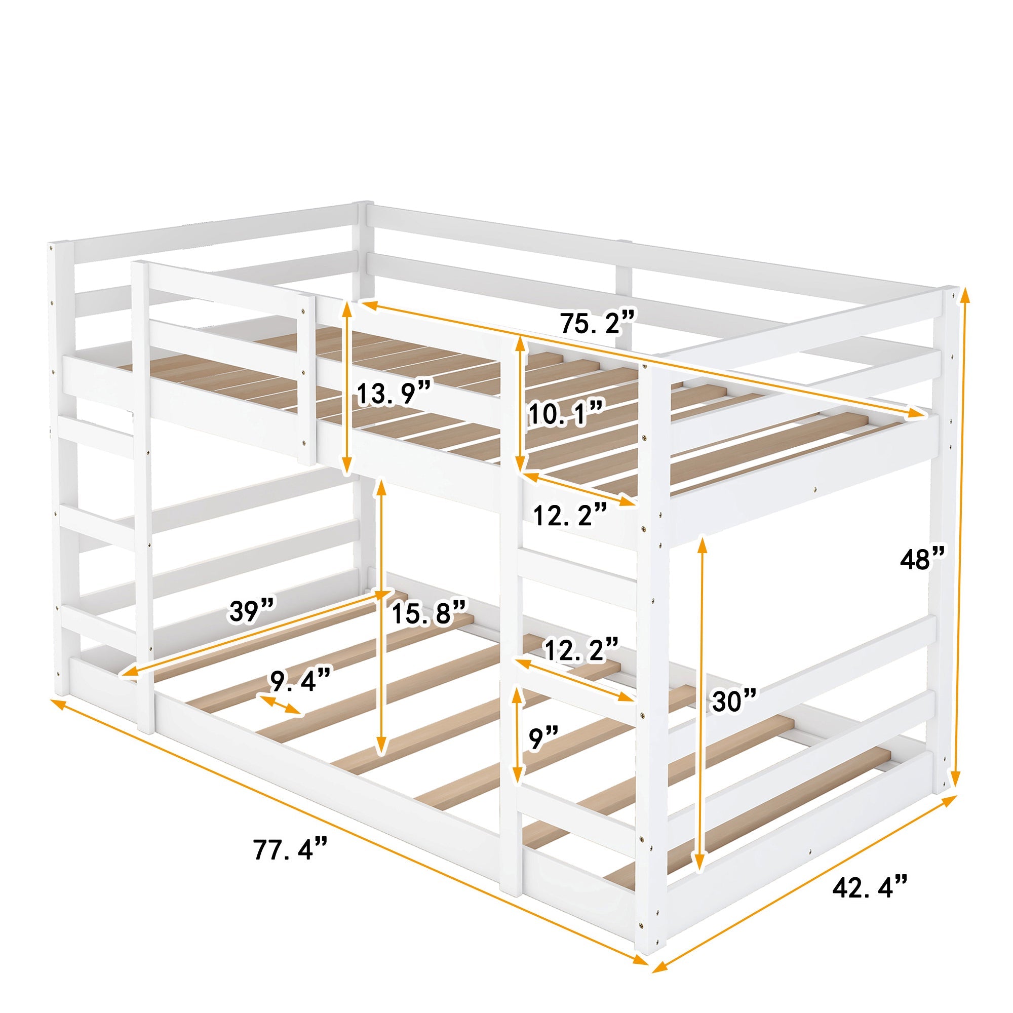 v [Dimensions]: This bunk bed fits two standard twin size mattresses (mattress is not included) , comes with slats so box spring is not needed. Overall dimensions: 77.4” L x 42.4” W x 48”H. Warranty: 1 year.