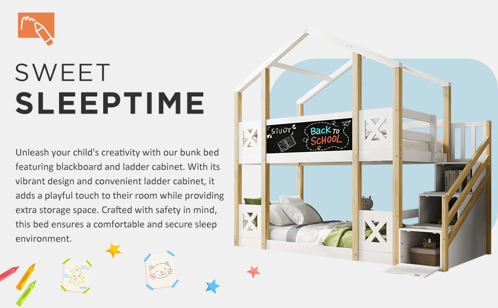 Twin over Twin House Bunk Bed with White Storage Staircase and Blackboards, White