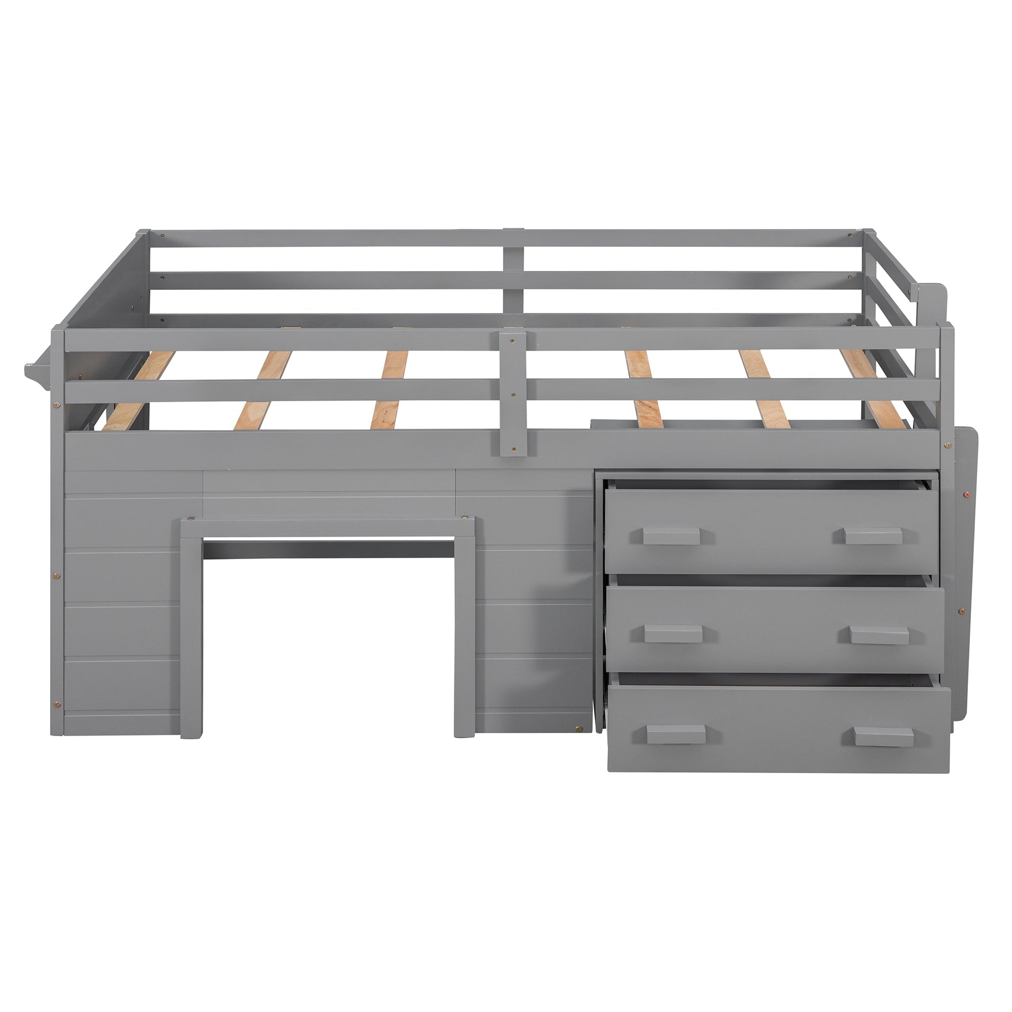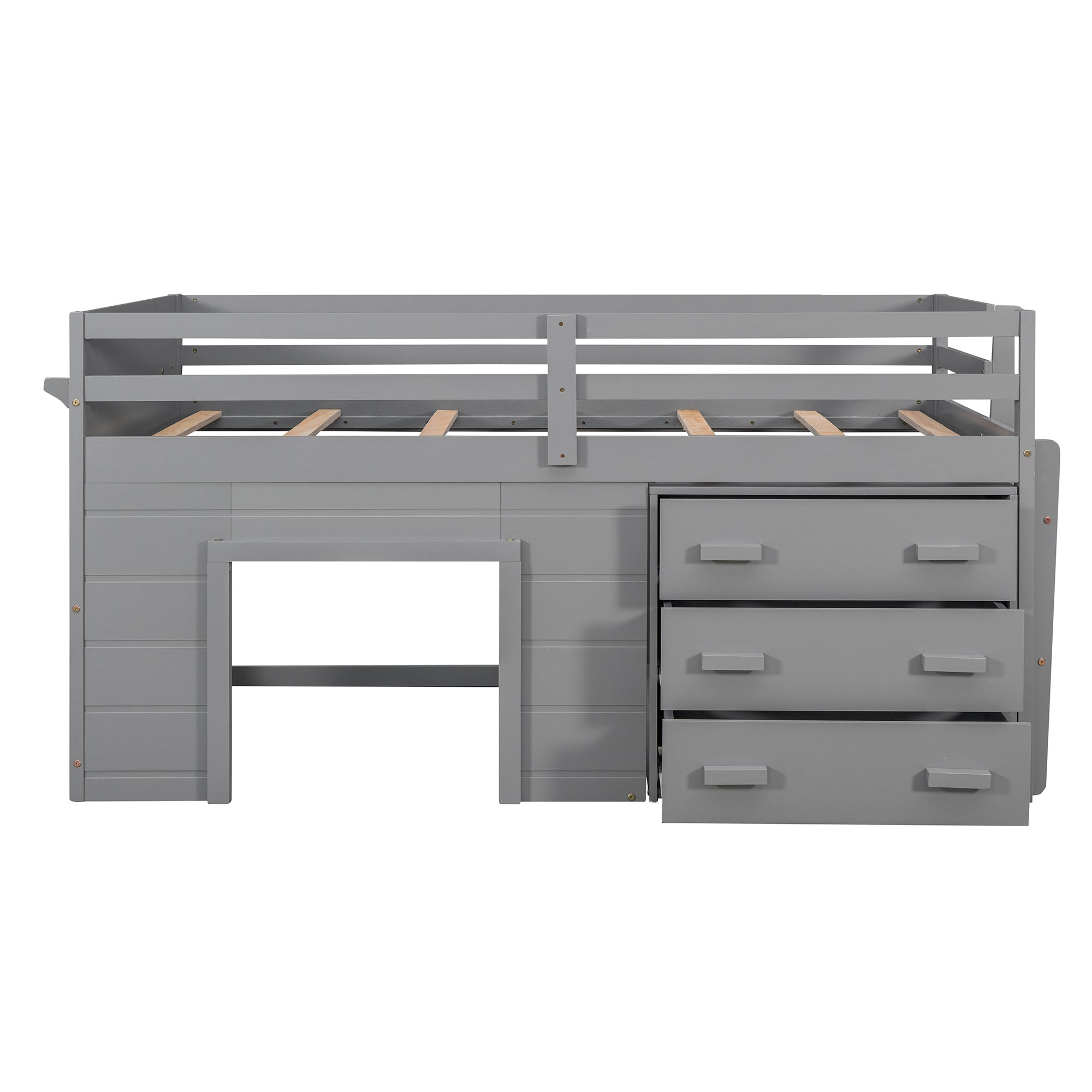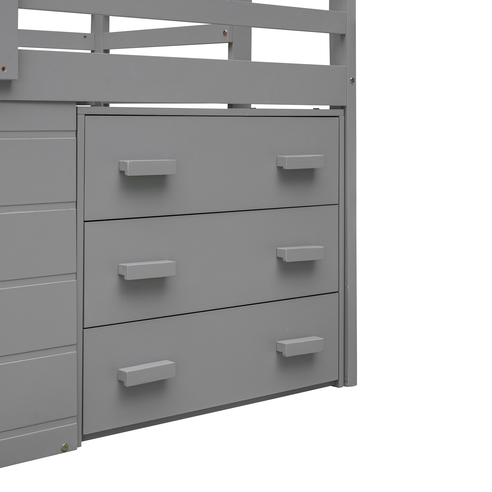 Crafted with high grade manufactured pinewood, enjoy the Loft bed in the shades espresso, gray and white to match the color scheme of any room. Designed with a loft structure, enjoy the space underneath used to house storage drawers. Three wide drawers provide plenty of storage options for you to help keep their space tidy and organized. The built-in two rung ladder provides easy access to the twin sized bed featuring full length safety guardrails.