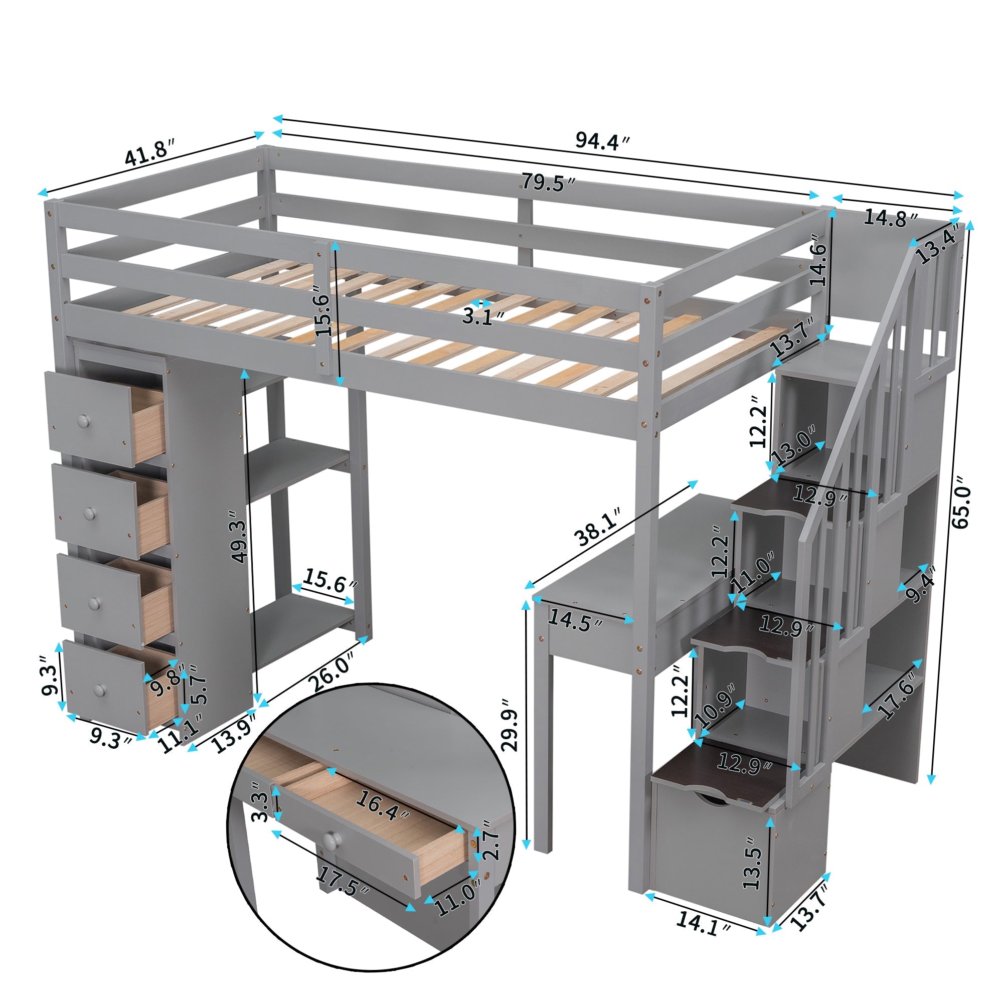 Twin size Loft Bed with Storage Drawers ,Desk and Stairs, Wooden Loft Bed with Shelves – Gray