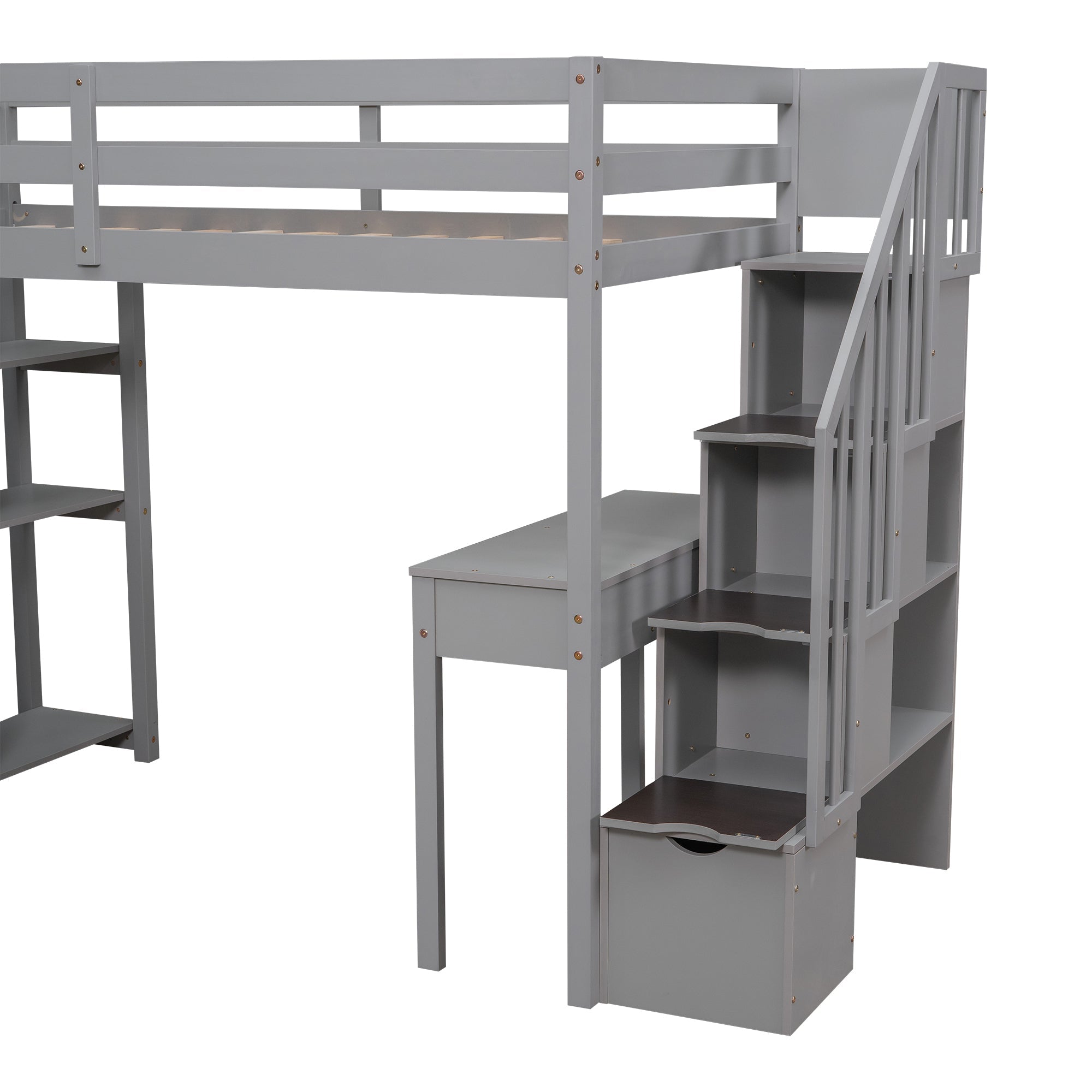 Twin size Loft Bed with Storage Drawers, Desk and Stairs, Wooden Loft Bed with Shelves – Gray