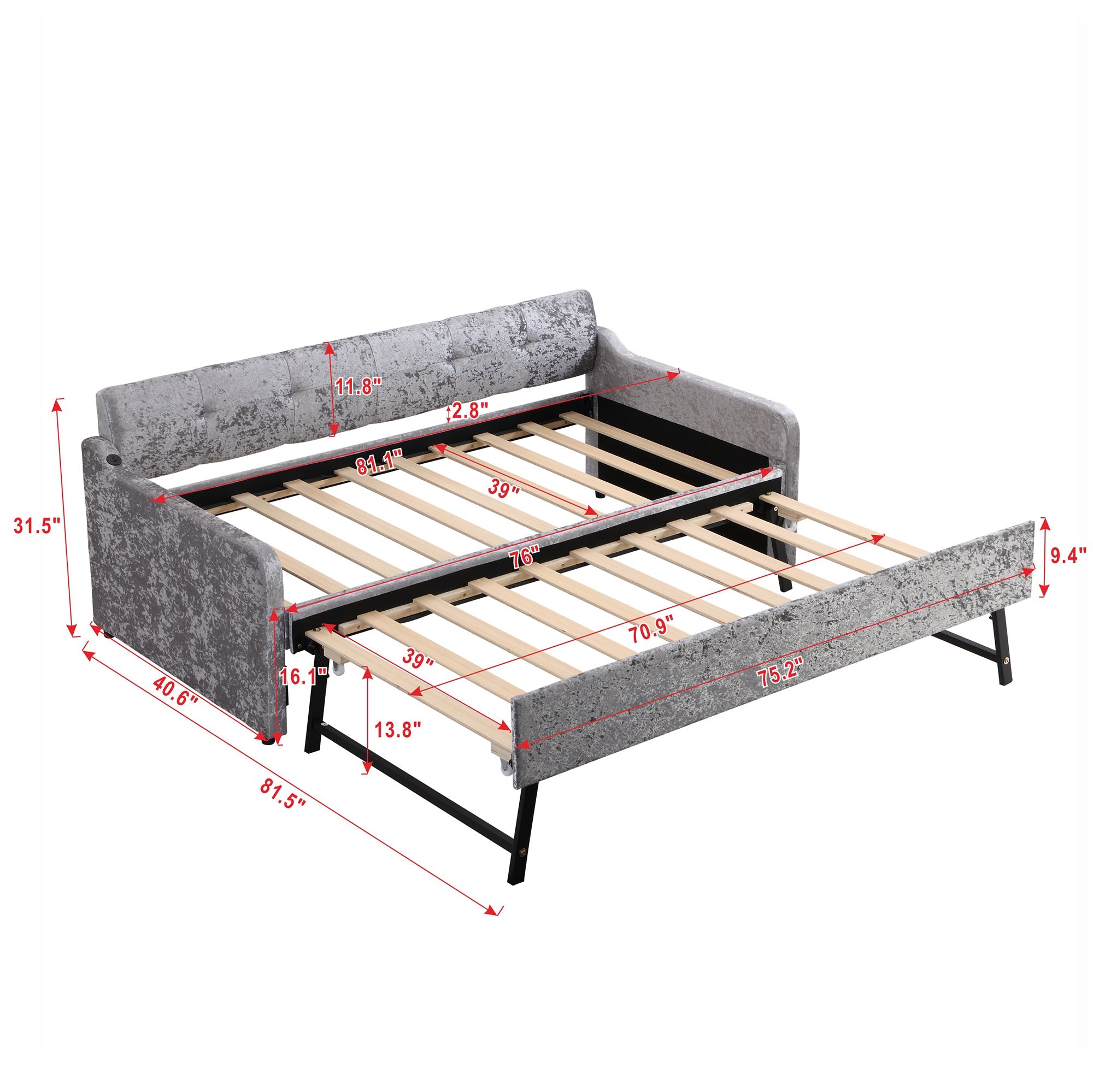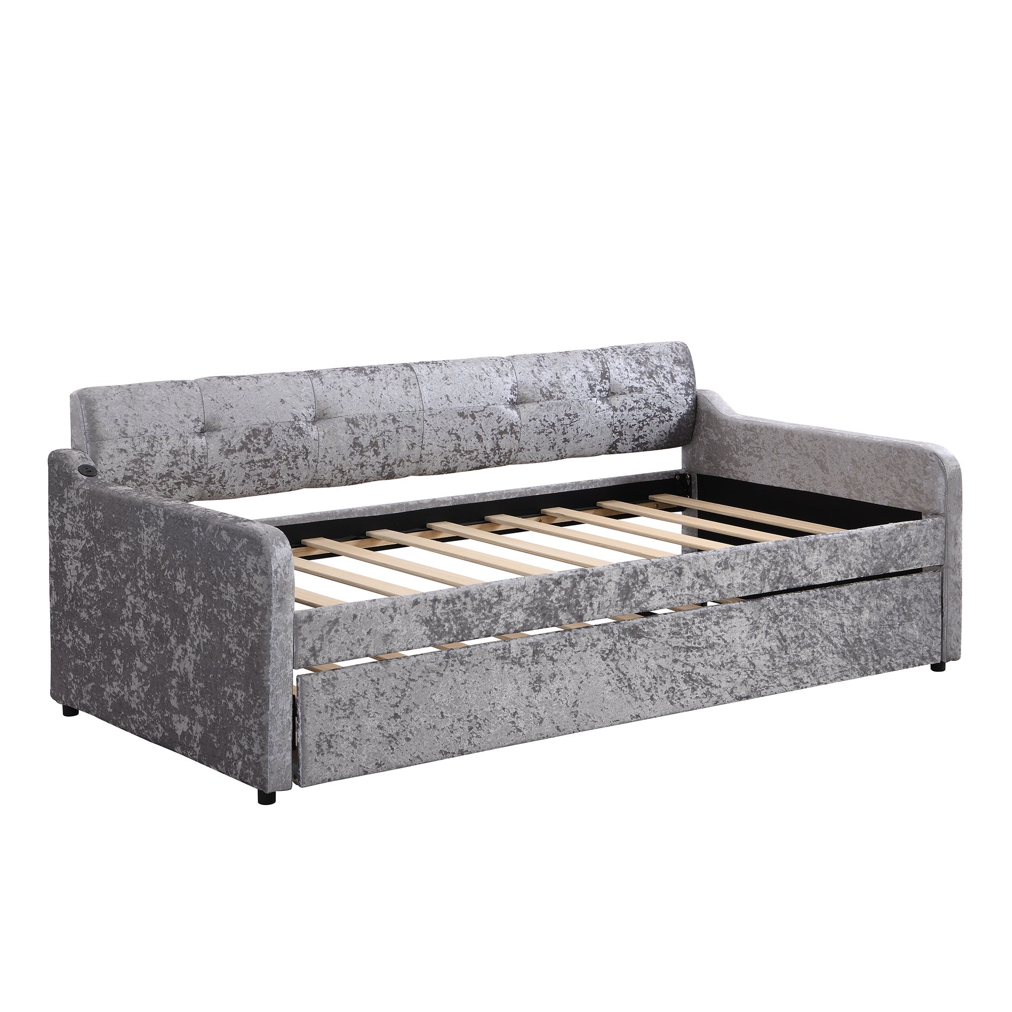 Twin Size Snowflake Velvet Daybed with Trundle and USB Charging Design,Gray