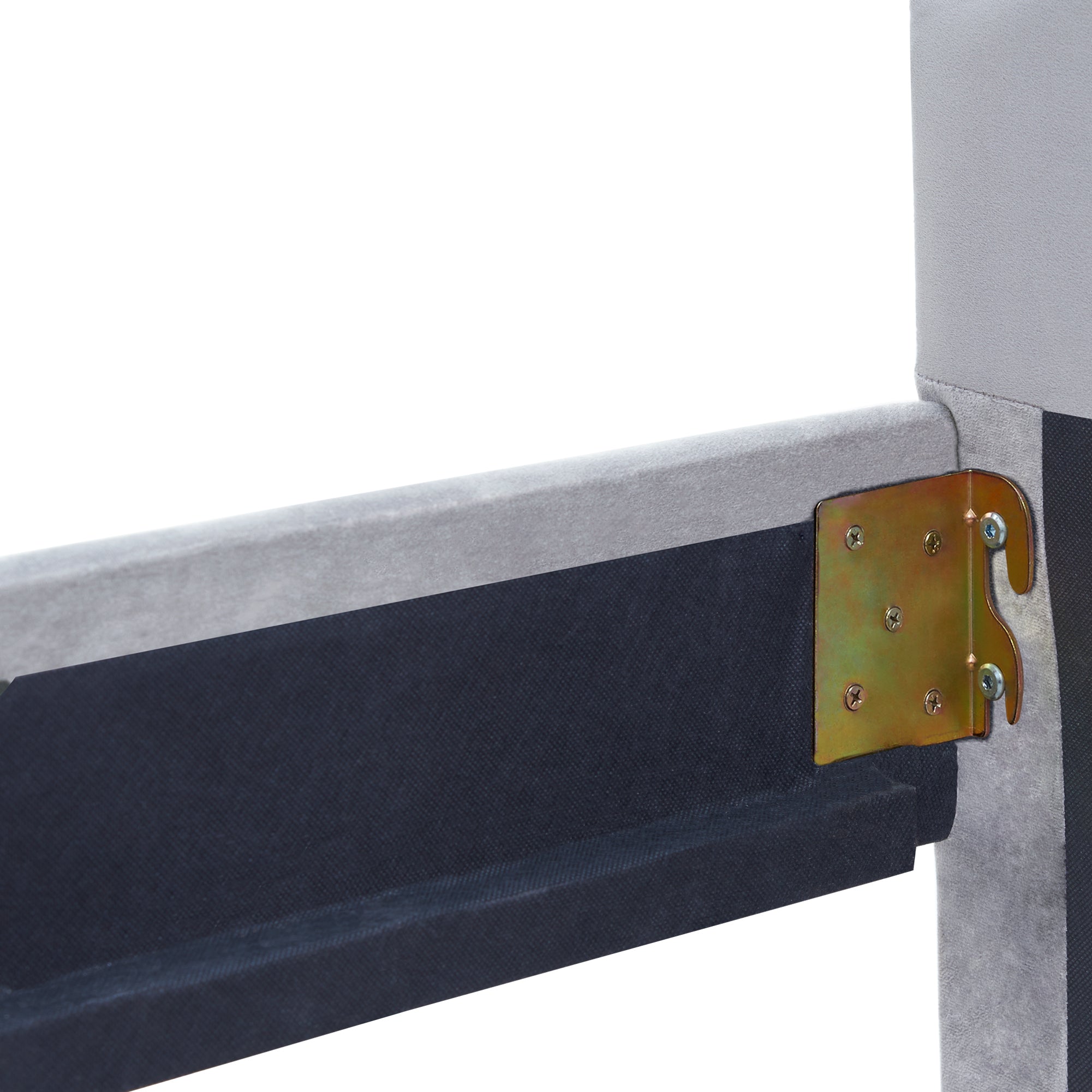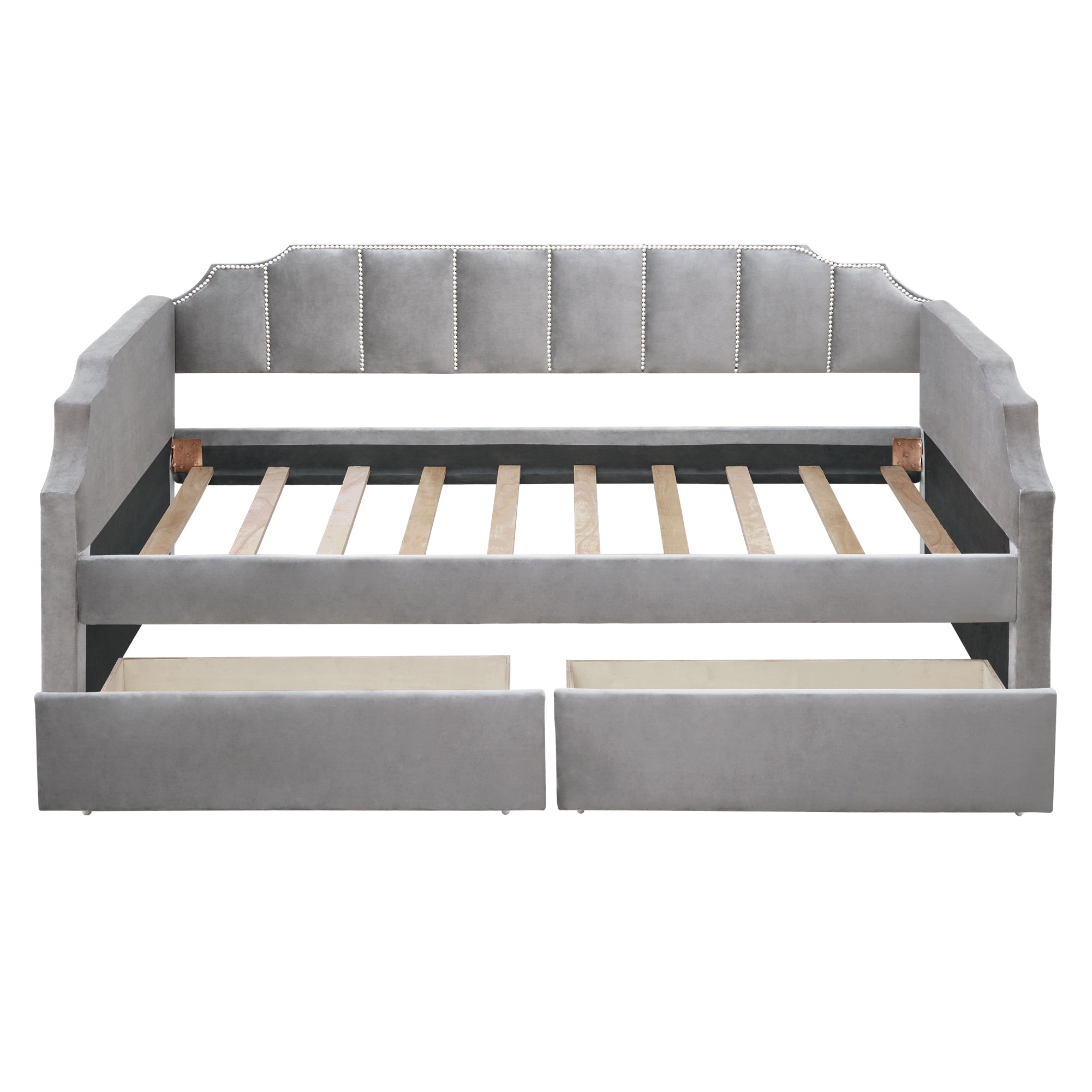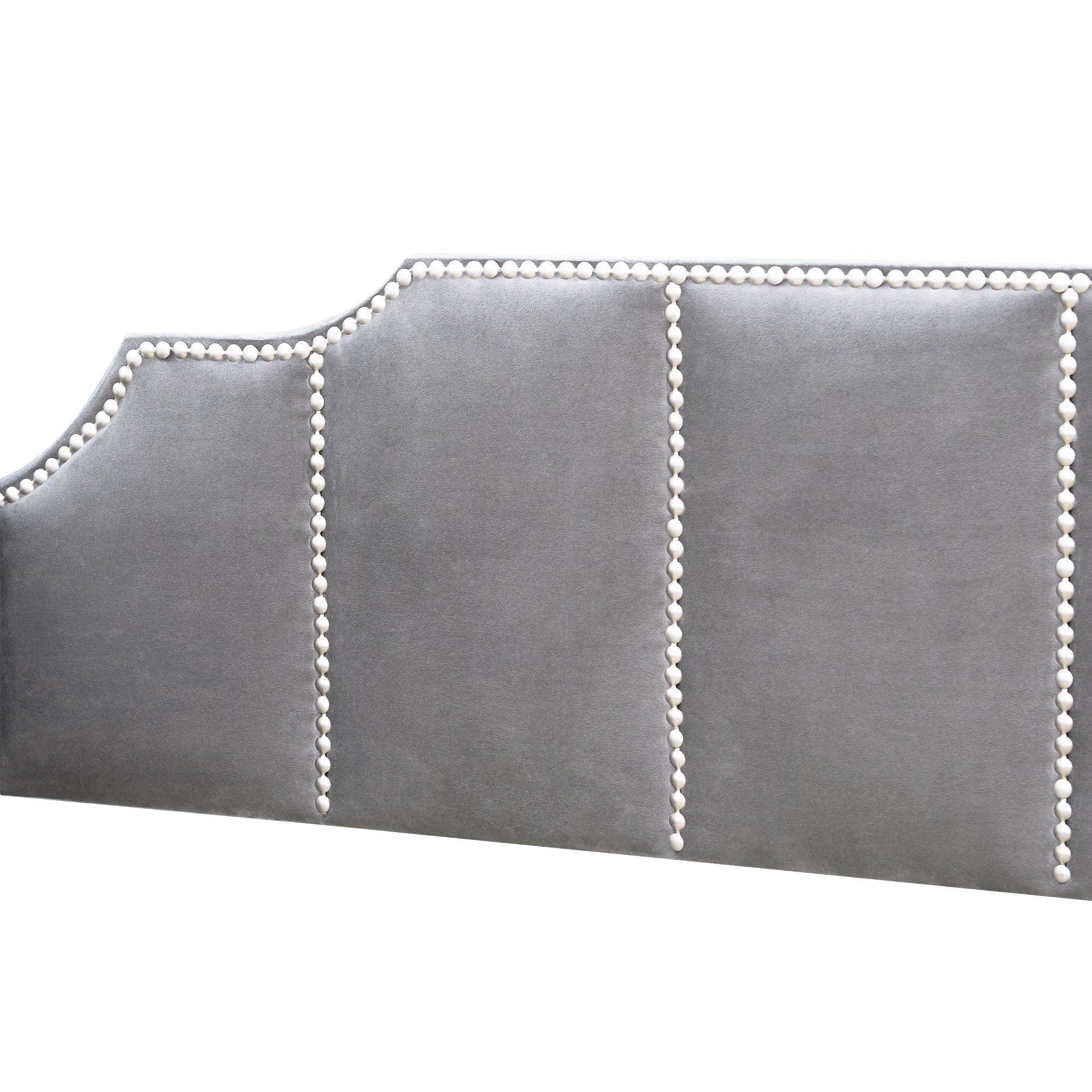 v [Elegant design] Elegant style Upholstered in carefully-selected velvet fabric, in elegant gray or beige, feature one backrest and two armrests with rivets, this daybed not only suits any home décor, but is timeless in its design. The soft textile bedhead creates coziness, while the two colors of the design creates versatility.