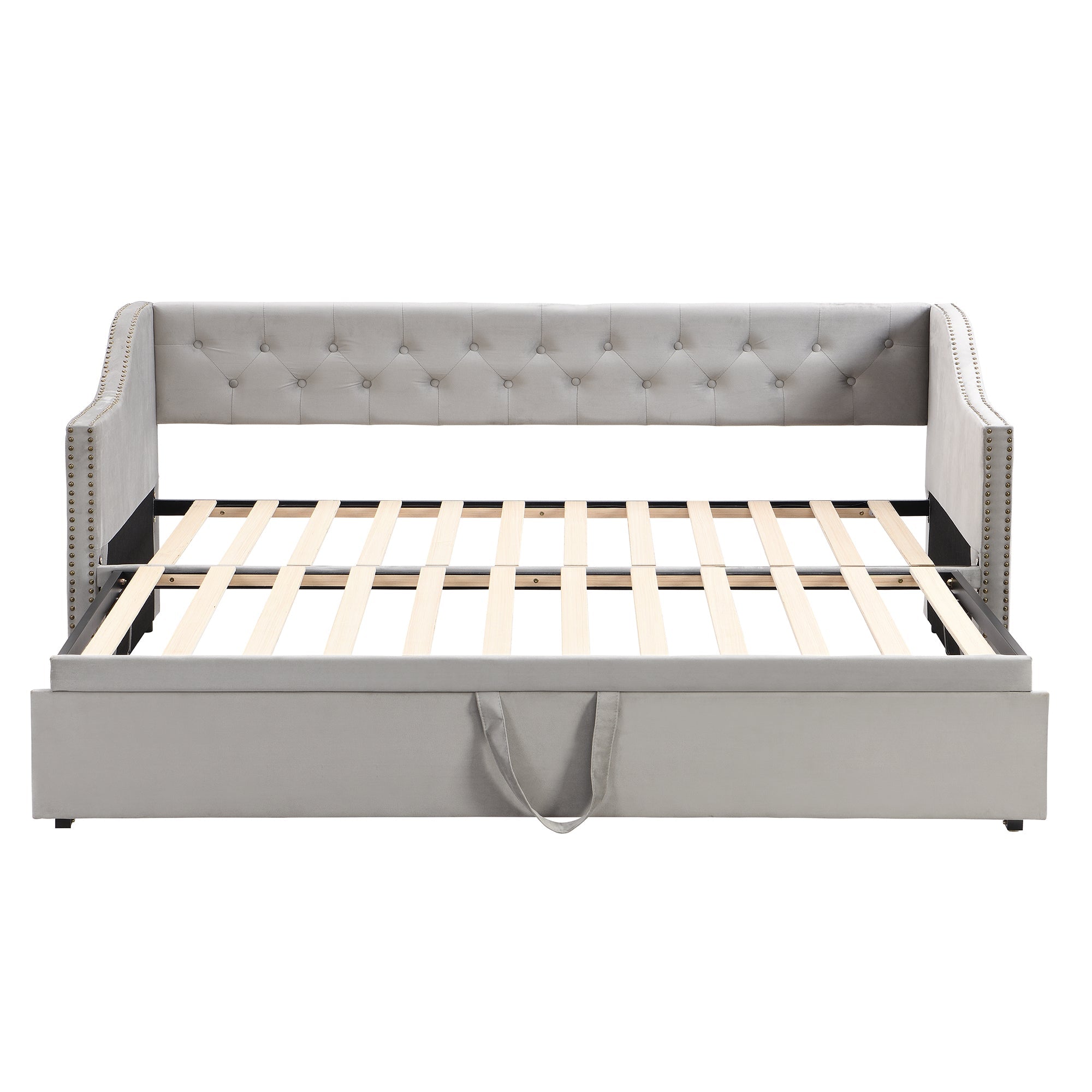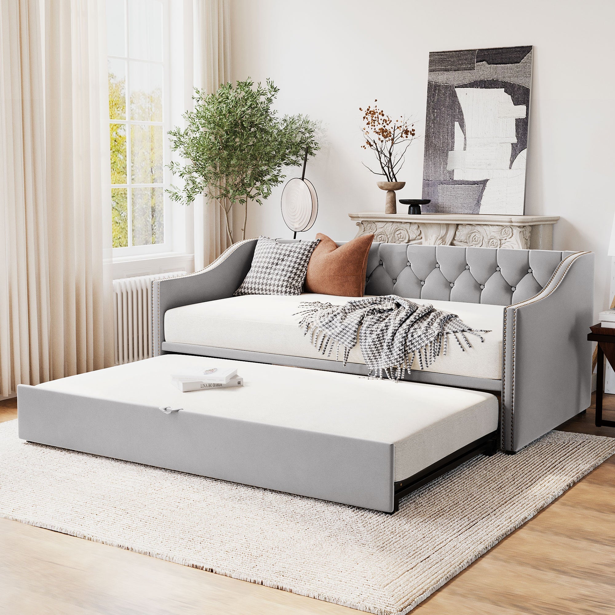 - [Elegant design] Upholstered in carefully-selected velvet, in elegant gray/beige/pink, featured with backrest and two armrests, this daybed not only suits any home décor, but is timeless in its design. The soft backrest and armrests creates coziness, while the single color of the design creates versatility.