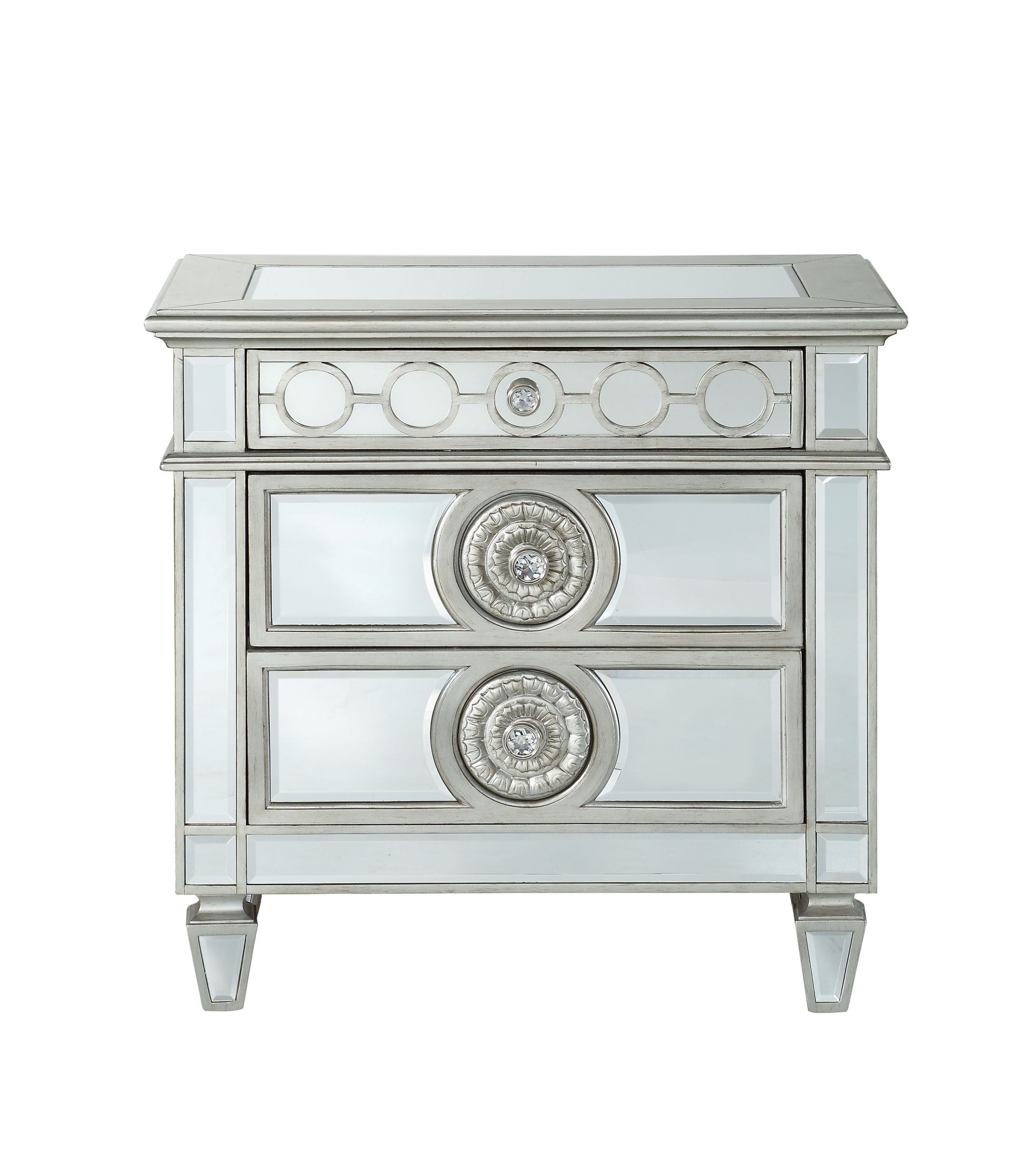 The Varian nightstand provides a commanding presence in any room. Add a dash of glam to your bedroom with this Varian nightstand, it features four tapered legs and 2 storage drawers with crystal-like knobs. This gorgeous nightstand is accented with raised geometric patterns and mirror finish. This fashionable nightstand will fuse with the surrounding Decor, transforming a room from ordinary into something interesting and sophisticated.