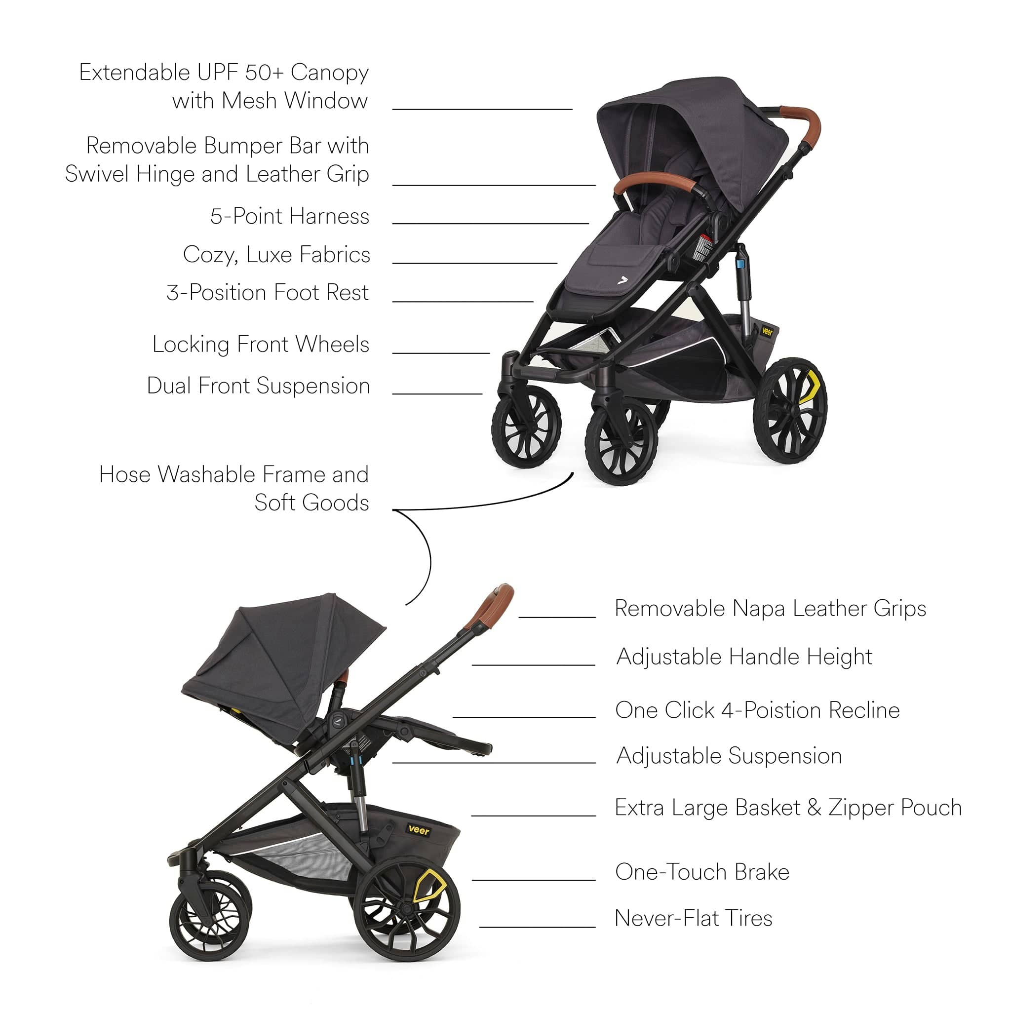 Glide effortlessly over city streets, grass and gravel with oversized tires and adjustable suspension that makes every ride feel smooth. A generous canopy protects your little one from the elements, while soft, hose-washable Luxe performance fabric makes cleanup less of a chore.