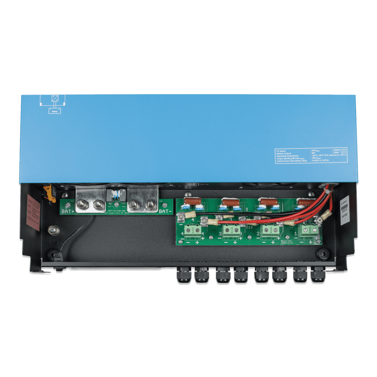 The MPPT VE.Can SmartSolar charger connects to a PV array of 150 or 250 Volt Voc and will automatically detect and charge your 12, 24, or 48V battery bank with current ranging from 70 to 100A depending on the model.
