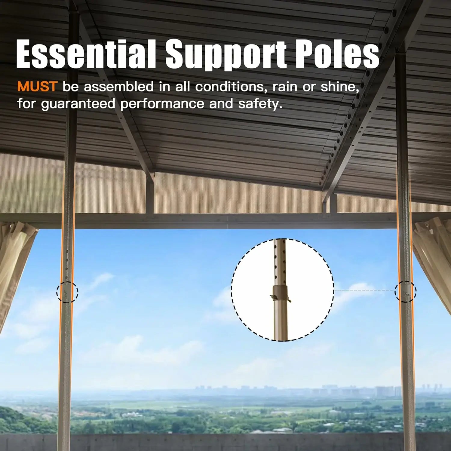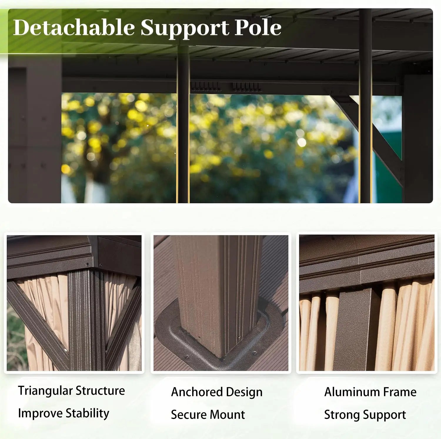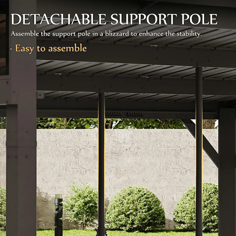 Additionally, it comes with two detachable support poles that can be conveniently stored away during regular use. When encountering extreme weather conditions, you can easily install them to ensure the stability and safety of the pavilion. The assembly and disassembly process is very simple.