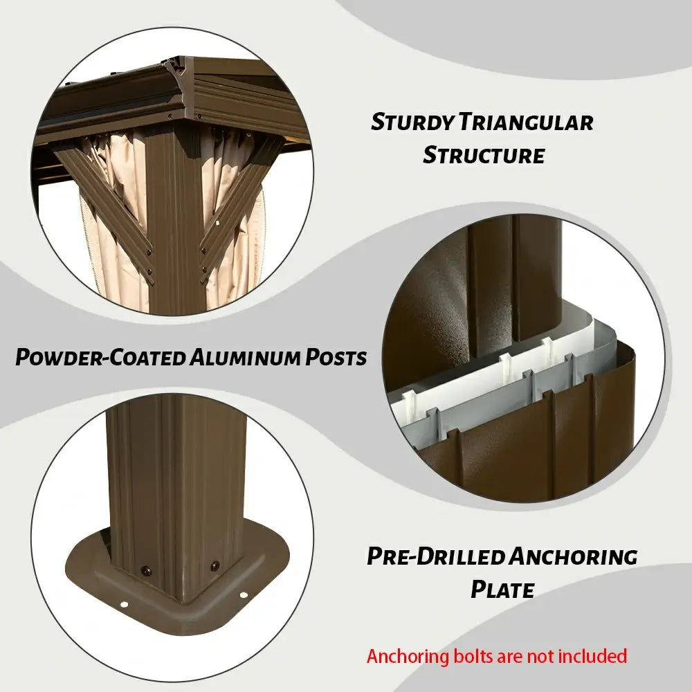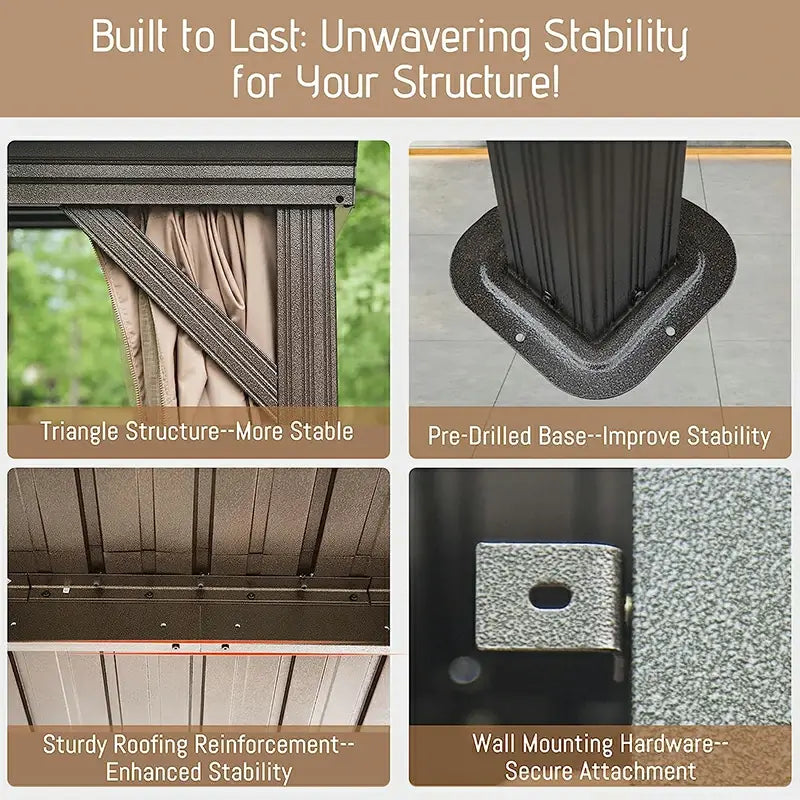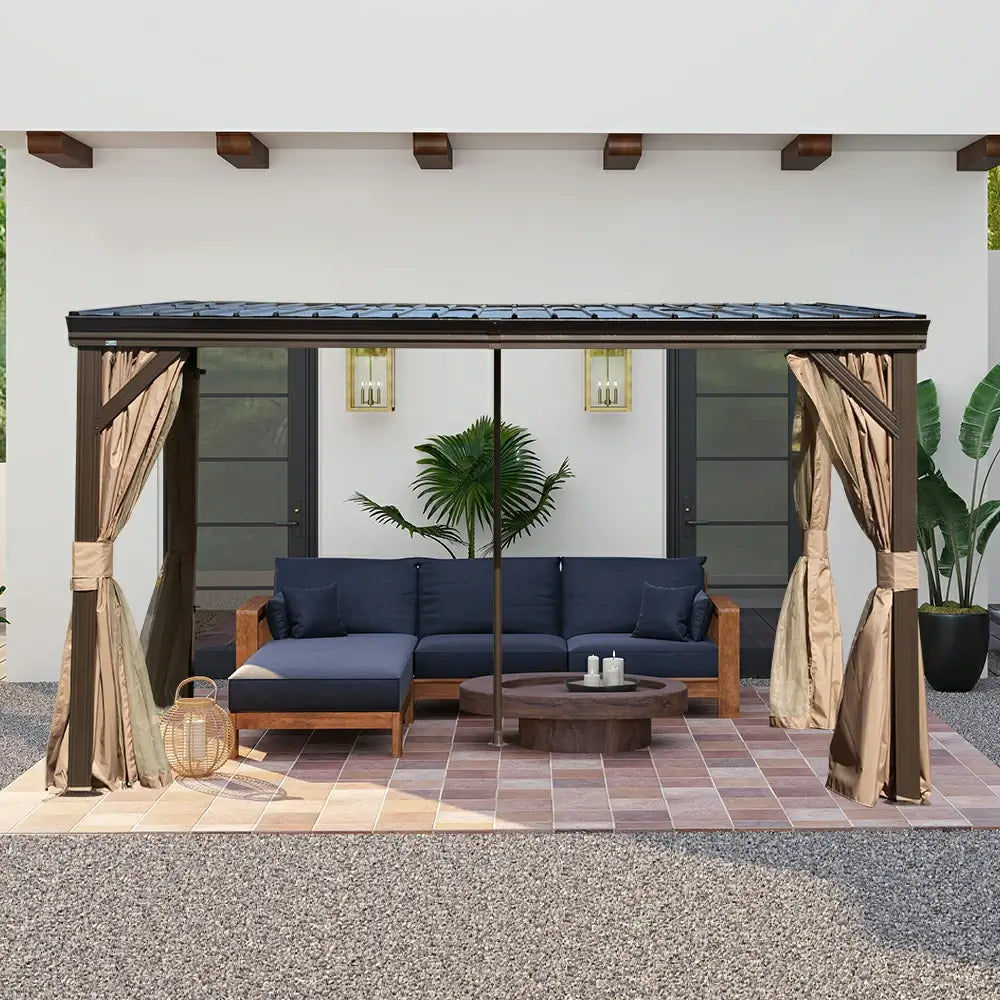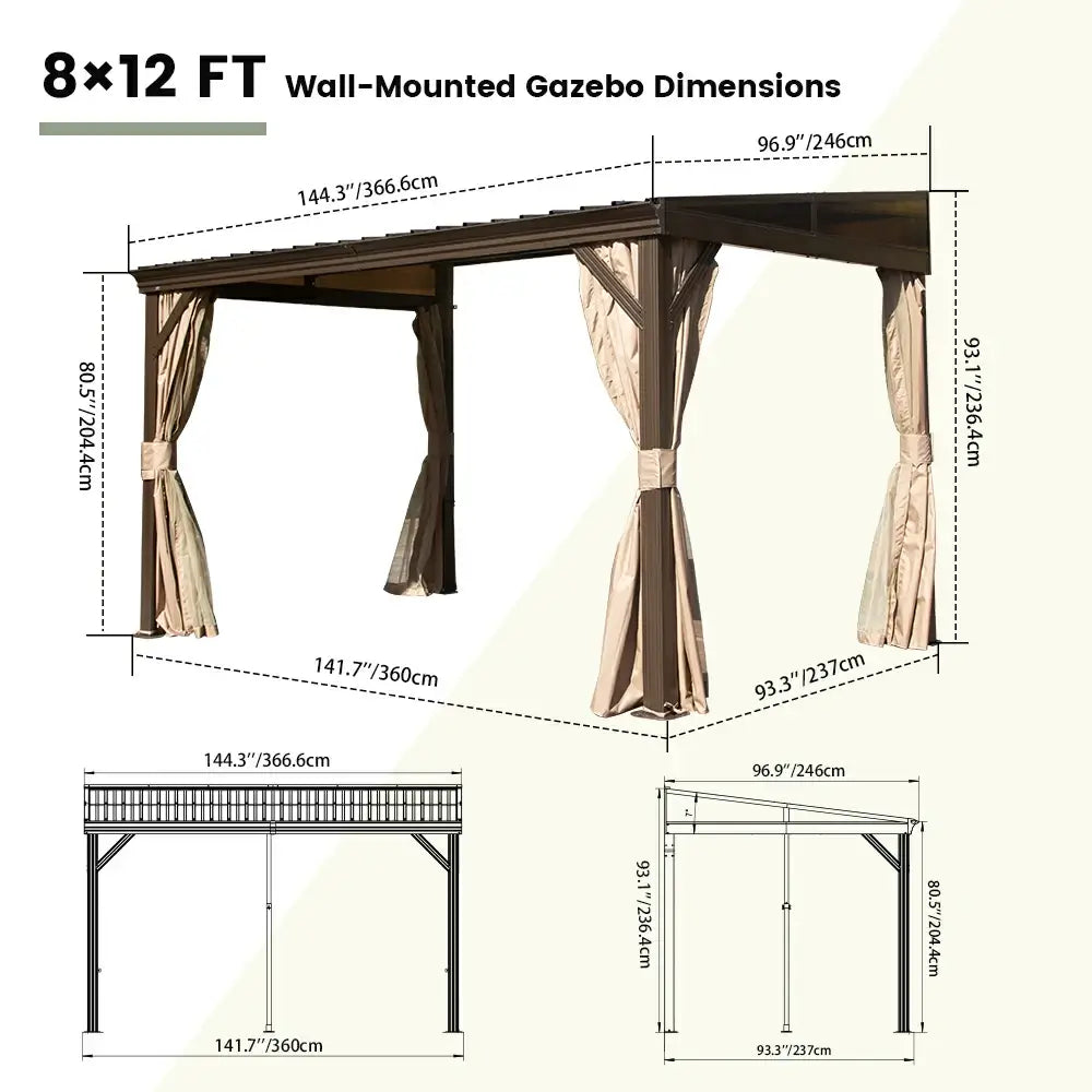 Crafted with a robust and durable aluminum frame, this gazebo offers exceptional strength and stability. Featuring pre-drilled holes in the back for fixing to the wall, it offers exceptional strength and stability. With its unique design, the Domi Outdoor Living Wall Mounted Hardtop Gazebo offers a reliable shelter, protecting you and your loved ones from the elements.