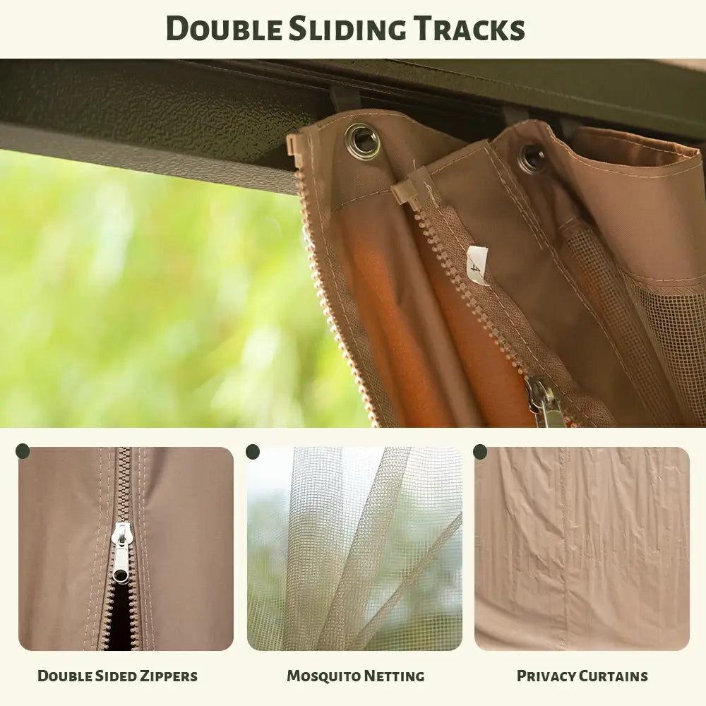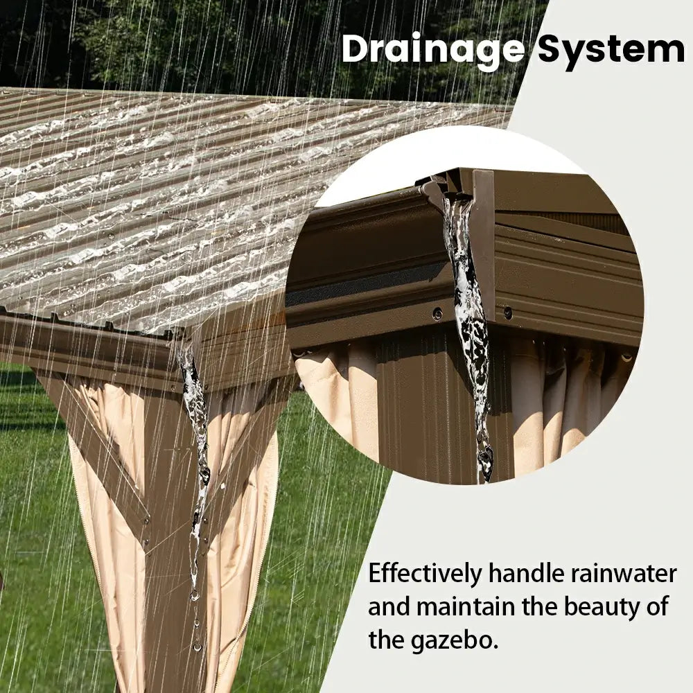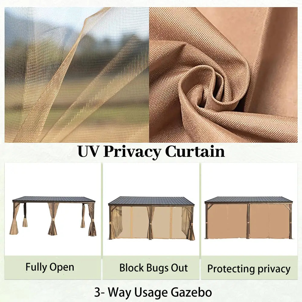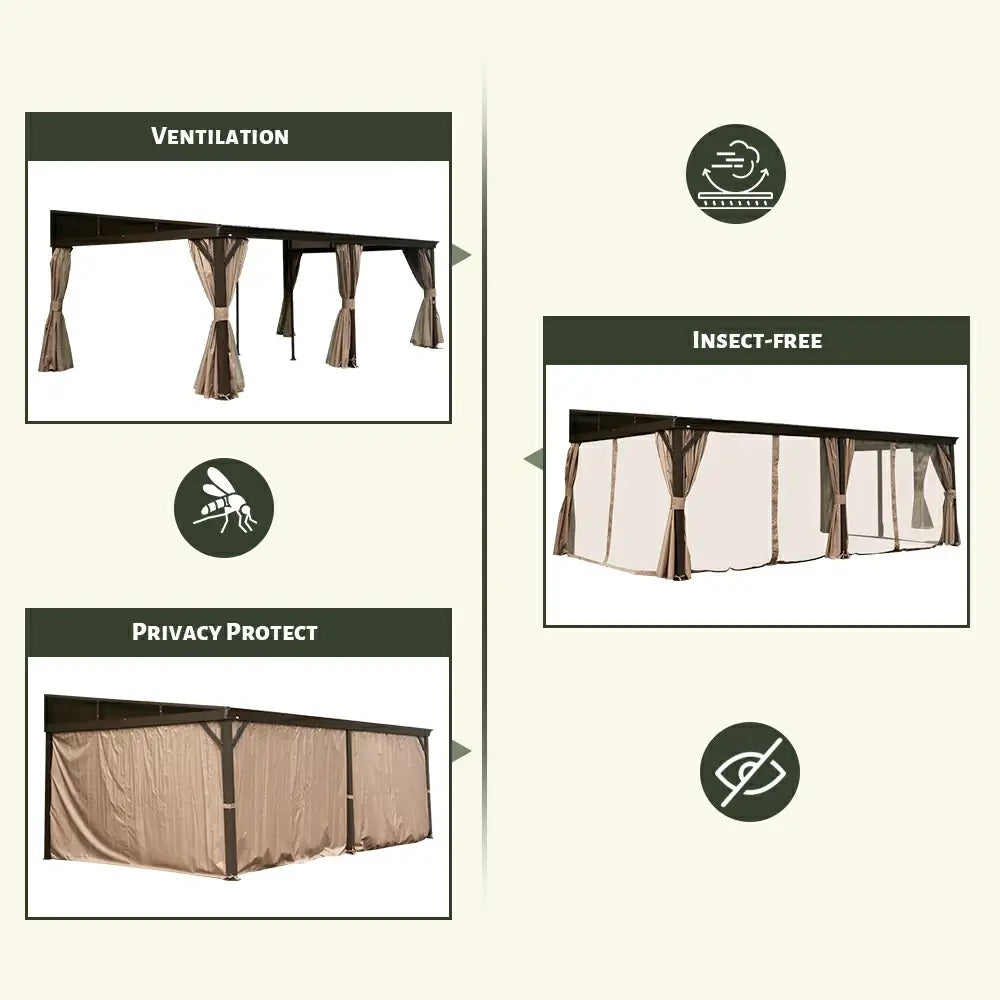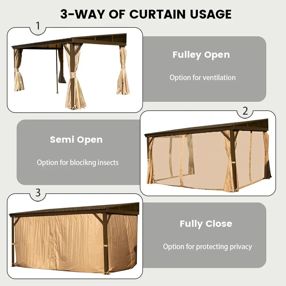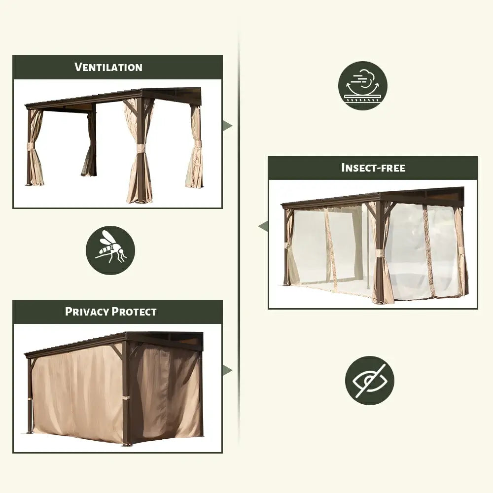 The gazebo comes equipped with curtains and netting, allowing you to customize your space based on your preferences. Draw the curtains for privacy and shade during the day, or let them flow gently in the breeze for an elegant touch. The netting keeps pesky insects at bay, ensuring a peaceful and enjoyable experience outdoors. Whether you’re hosting a barbecue, enjoying a family gathering, or indulging in some personal relaxation time, this gazebo sets the perfect stage for memorable moments.