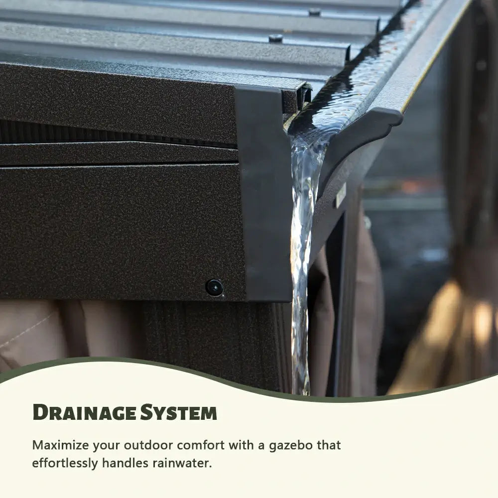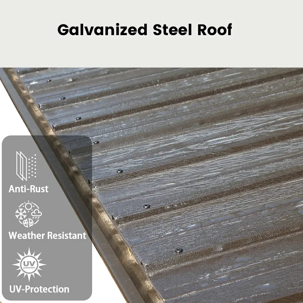 The Lean-to-Gazebo features a sloping galvanized steel roof that not only enhances the visual appeal but also ensures efficient water drainage. Gutters are designed at the front of the roof to collect rainwater to run down the posts. The modern design blends seamlessly with any outdoor aesthetic, adding an element of sophistication to your space.
