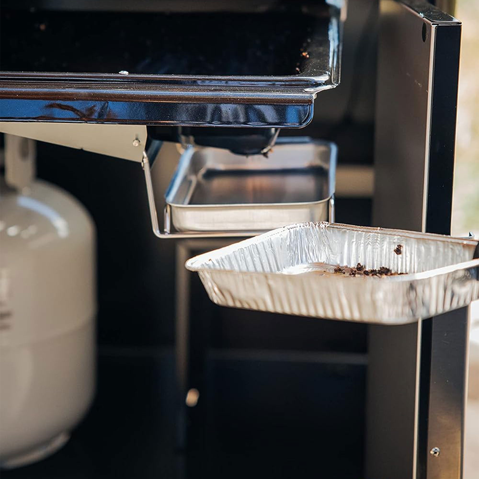 - Pull-out grease tray makes cleaning up after cooking a breeze