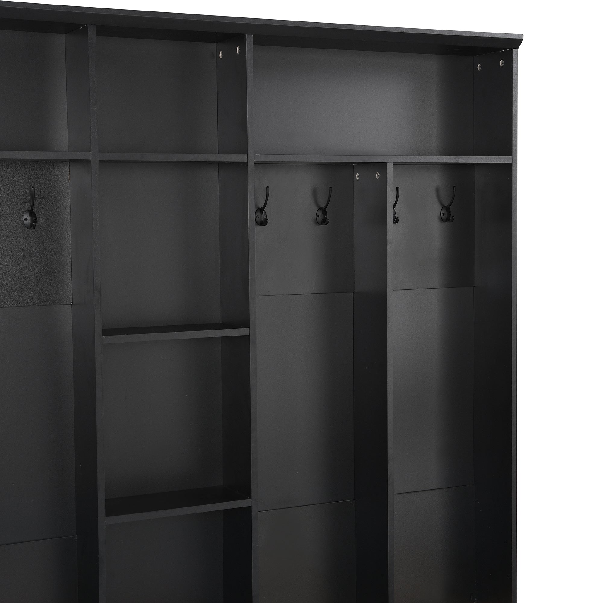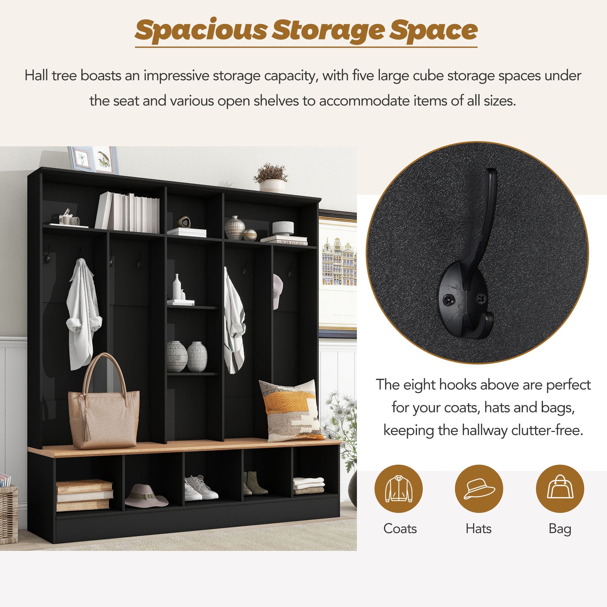 Wide Design Hall Tree with Storage Bench, Minimalist Shoe Cabinet with Cube Storage & Shelves, Multifunctional Coat Rack with 8 Hooks for Entryways, Mudroom, Black