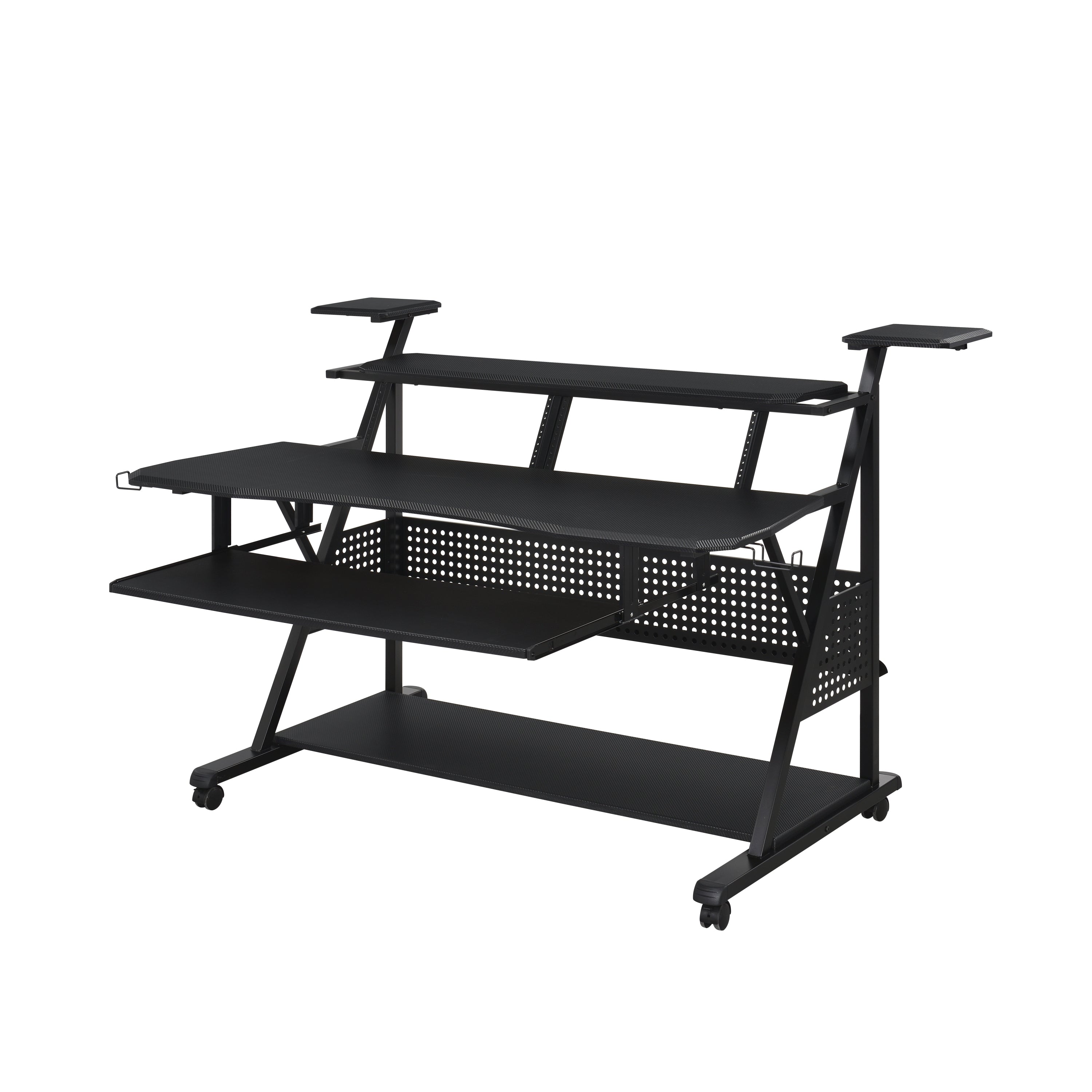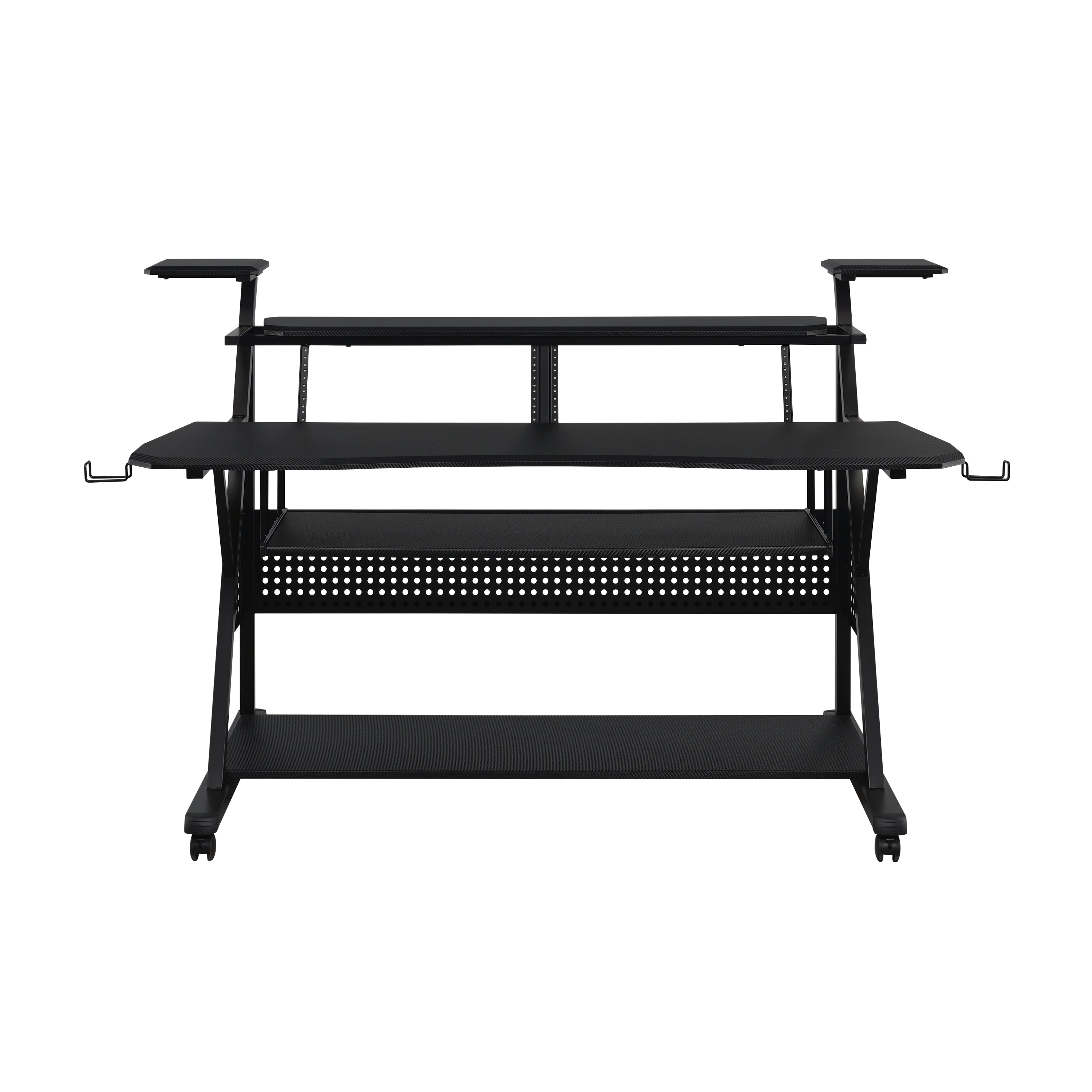 (Catalog) : •KD Rectangular Music Desk•Speaker Shelves Included•Multiple Pass-Through Cable Holes•Keyboard Tray Included•Earphone Rack Included•Preformed Screw Holes for Fix Equipment•4 Wheels Included