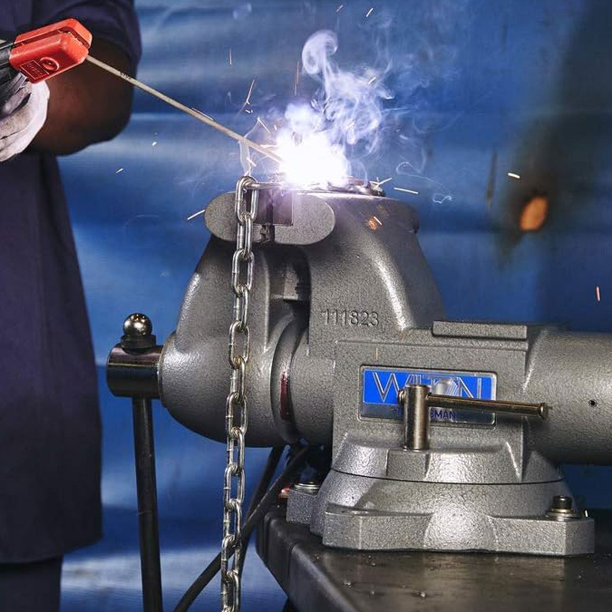 This general purpose bench vise is ideal for clamping down lumber, pipe, and more while you drill, saw, or fasten. Crafted out of high strength steel, this shop vise features a double lock down swivel base and large anvil work surface that’s great for hammering. Its specialized jaws are great at holding irregular materials, just as up to 4 inches of pipe, plus the 60,000 PSI of ductile iron strength won’t let go.