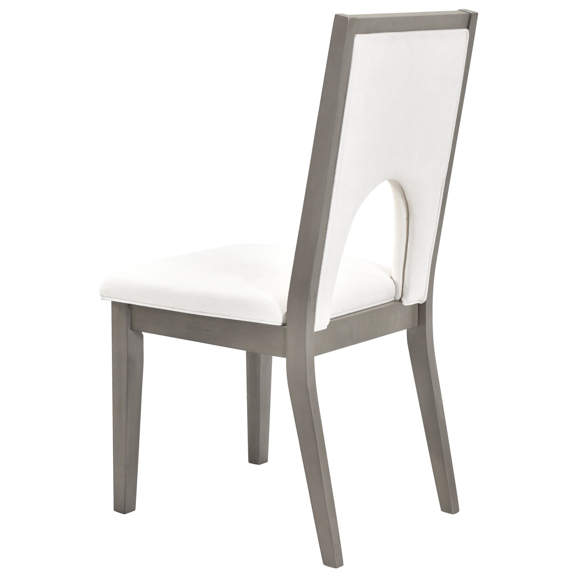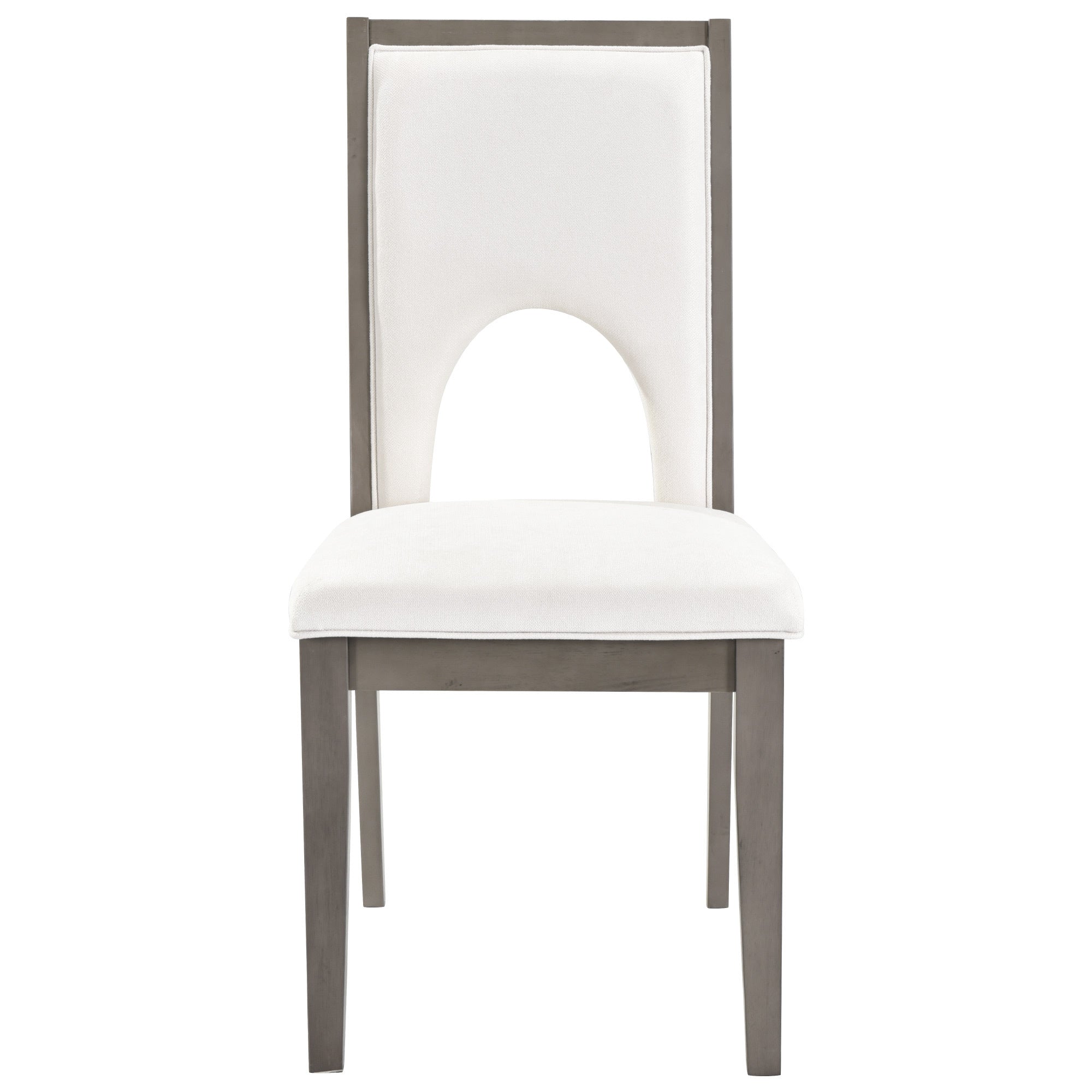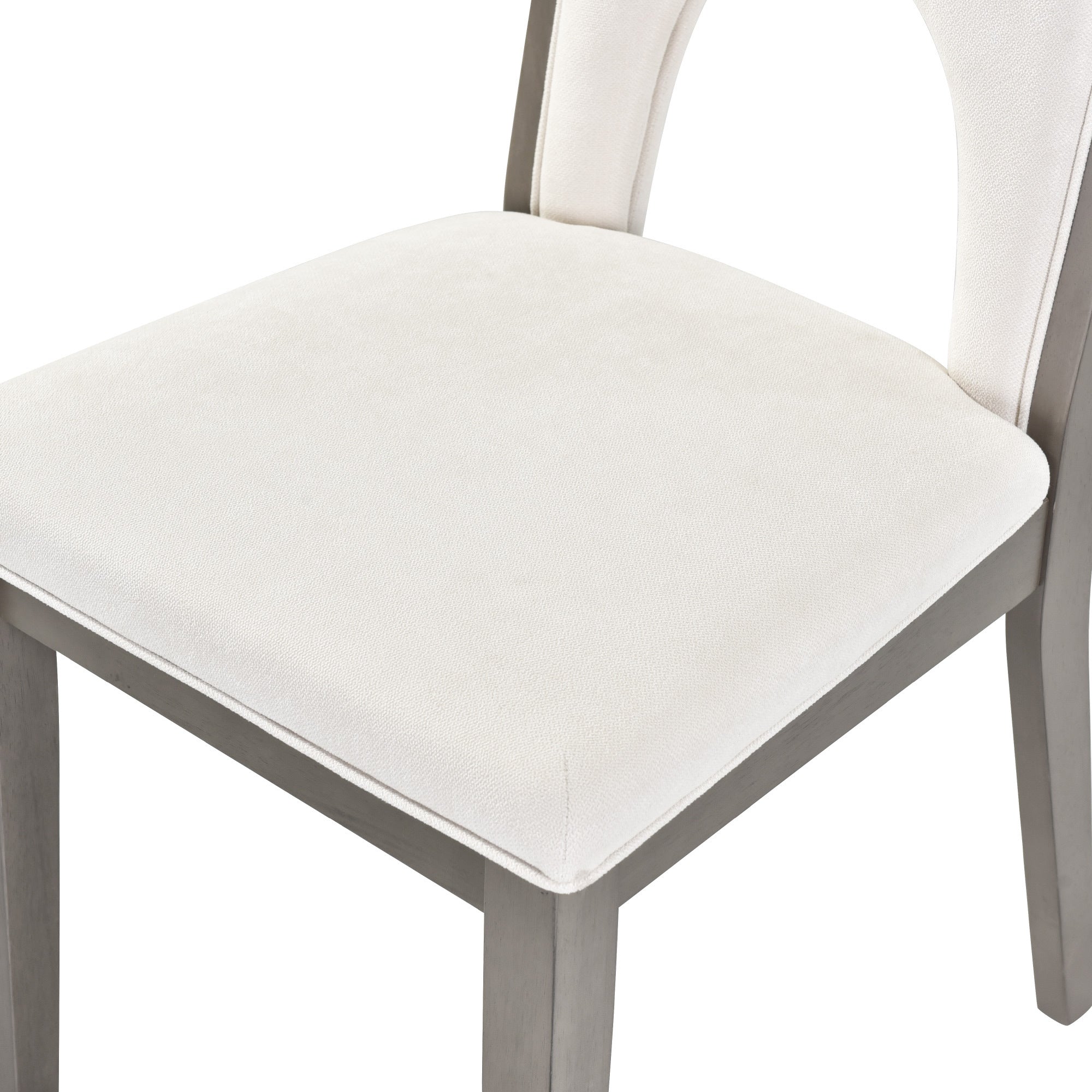 • The grey finish add a distinctly rustic look that easily updates any household.The natural wood grain of the tabletop of this dining table set complements a variety of unique interior styles by blending in seamlessly. Special U-shape design for table legs and chair backrests undoubtedly showcase a classic look, featuring an elegant and retro flair. Also, this chair backrest design is more breathable, which can bring you a more comfortable experience.
