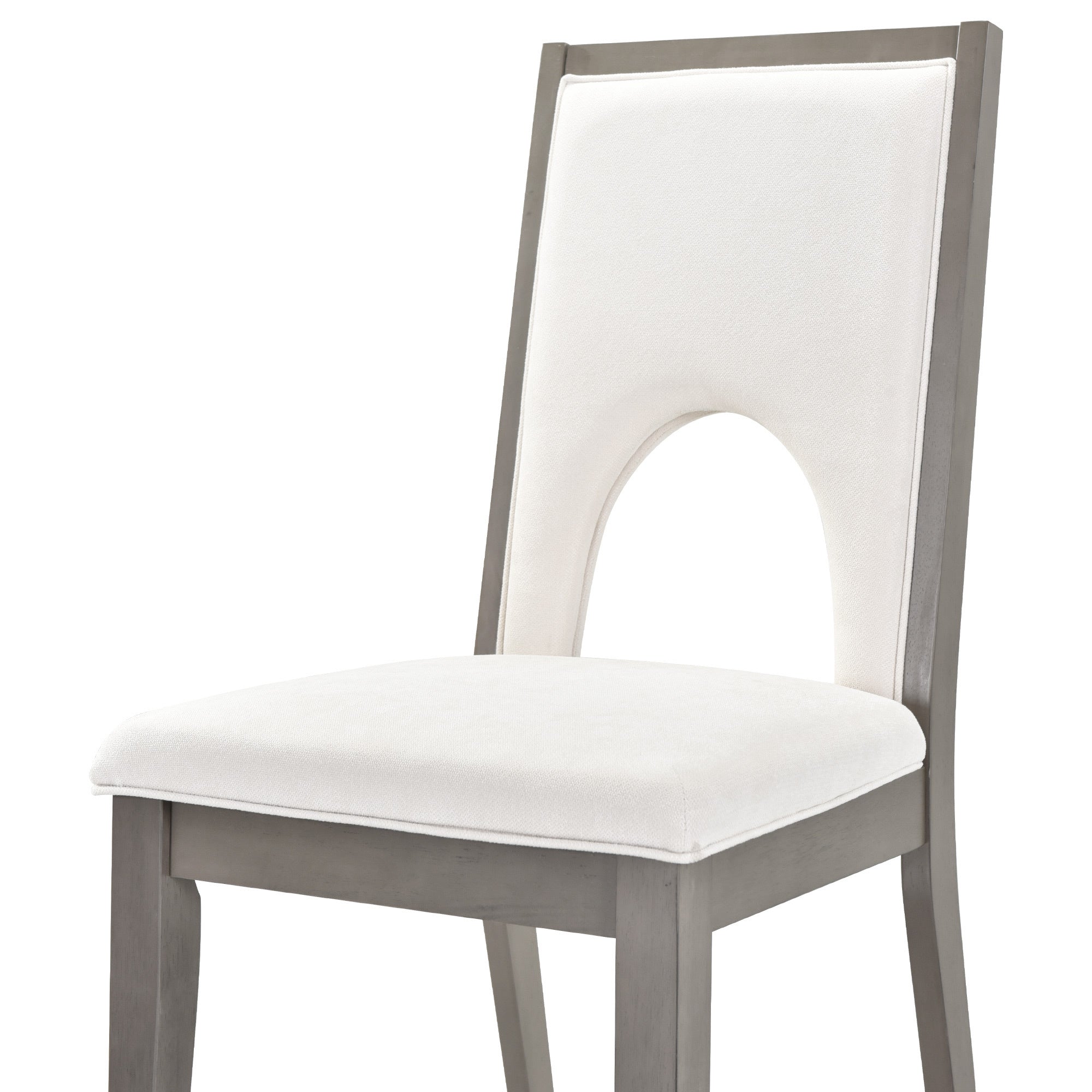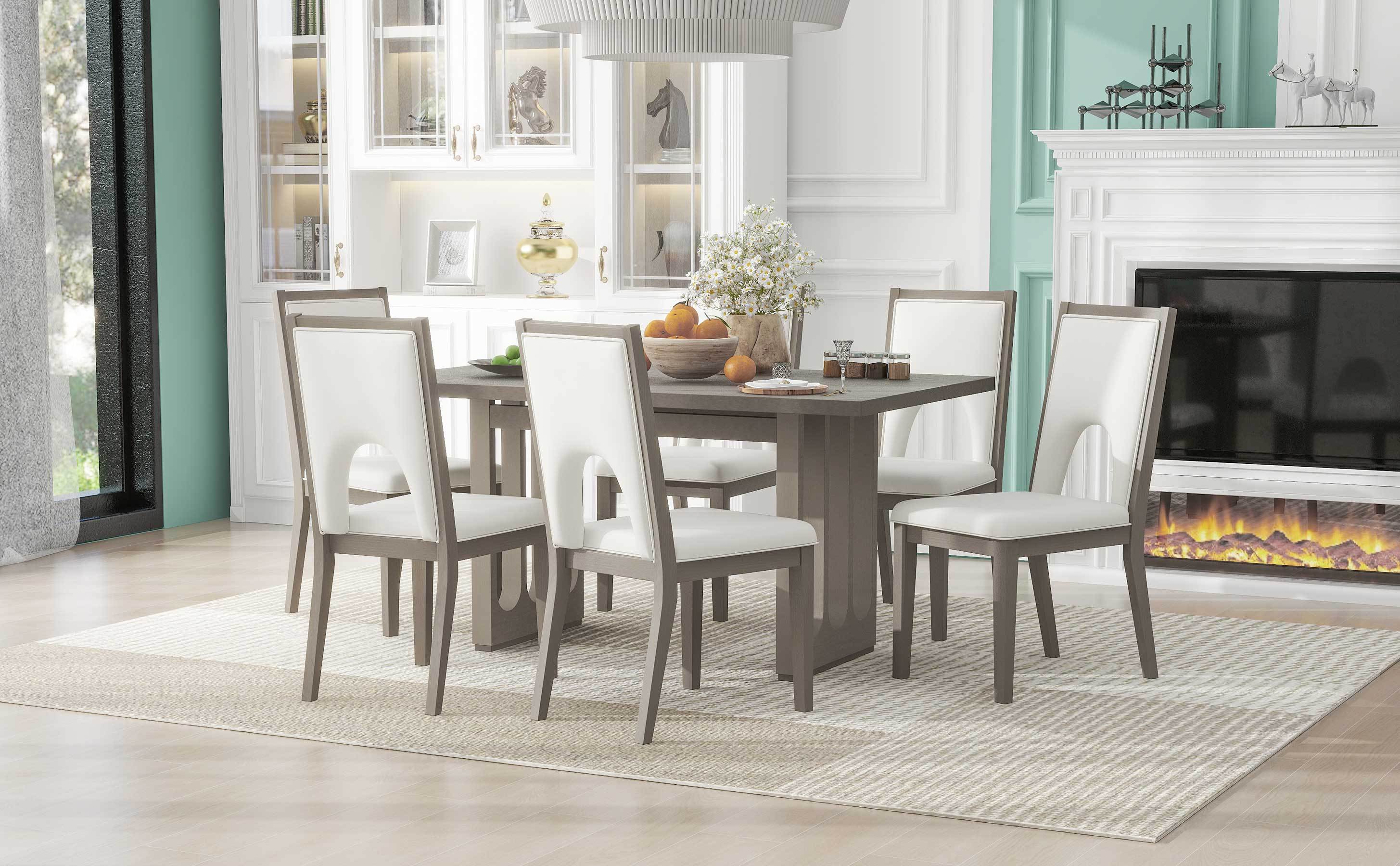 Gather everyone around this dining set – it can comfortably seat 6 people with one table and six chairs, create a beautiful and relaxed dinner time. The natural wood wash and grey finish add a distinctly rustic look that easily updates any household. Special U-shape design for table legs and chair backrests undoubtedly showcase a classic look, featuring an elegant and retro flair.